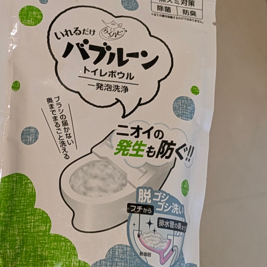 念入り掃除に、塩素系混ぜるな危険系の洗浄剤です。これを一袋トイレに入れるだけでもっこもこの泡が、便器いっぱいに広がります。溢れるんじゃないか?と心配になるのですが、パッケージ通りのちょうどいい所で泡は止まります。推奨30分ほど置くと徐々に泡は消えていくので、泡が完全になくなるまで、水で流すだけでお掃除完了です♪ いつもよりぴかぴかになった気がします。