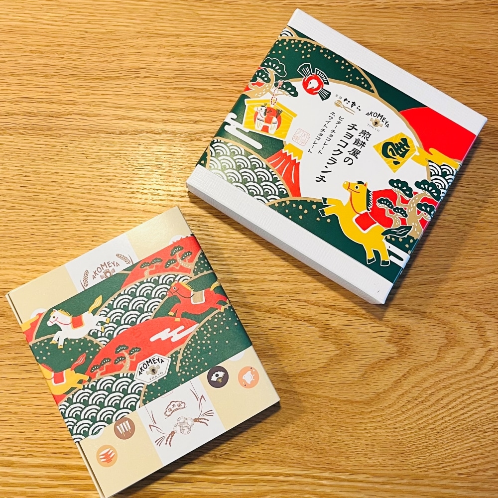 パッと目を引く華やかなパッケージの「煎餅屋のチョコクランチ 2026年お年賀デザイン」。