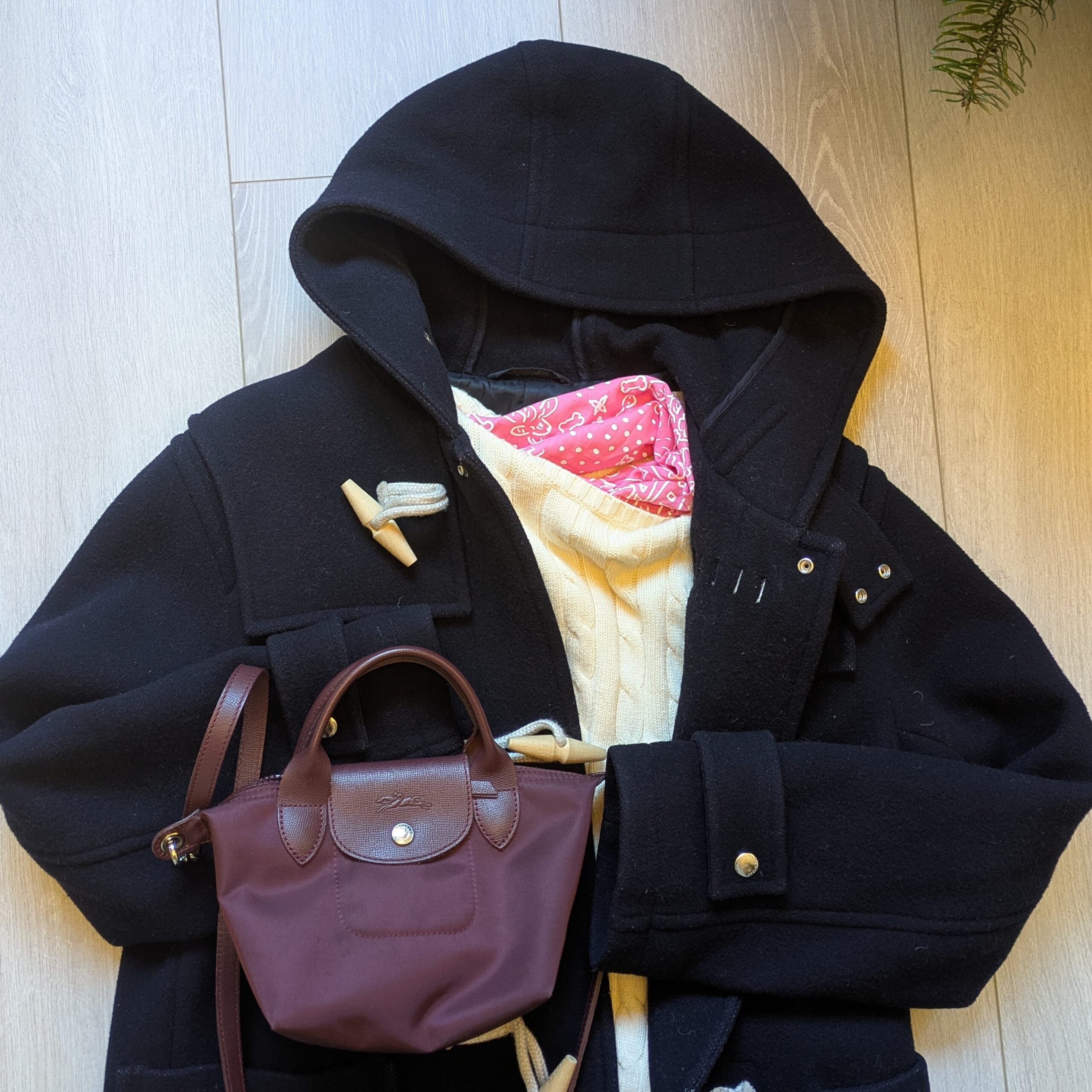 (プチエピソード: このコーデでルンルン歩いていたら、通りすがりの御婦人二人組に「あなたのスタイルとてもステキ!そのコートどこで買ったの?」と声をかけられました。ピンクの差し色効果かしら!?と前向きに解釈。)