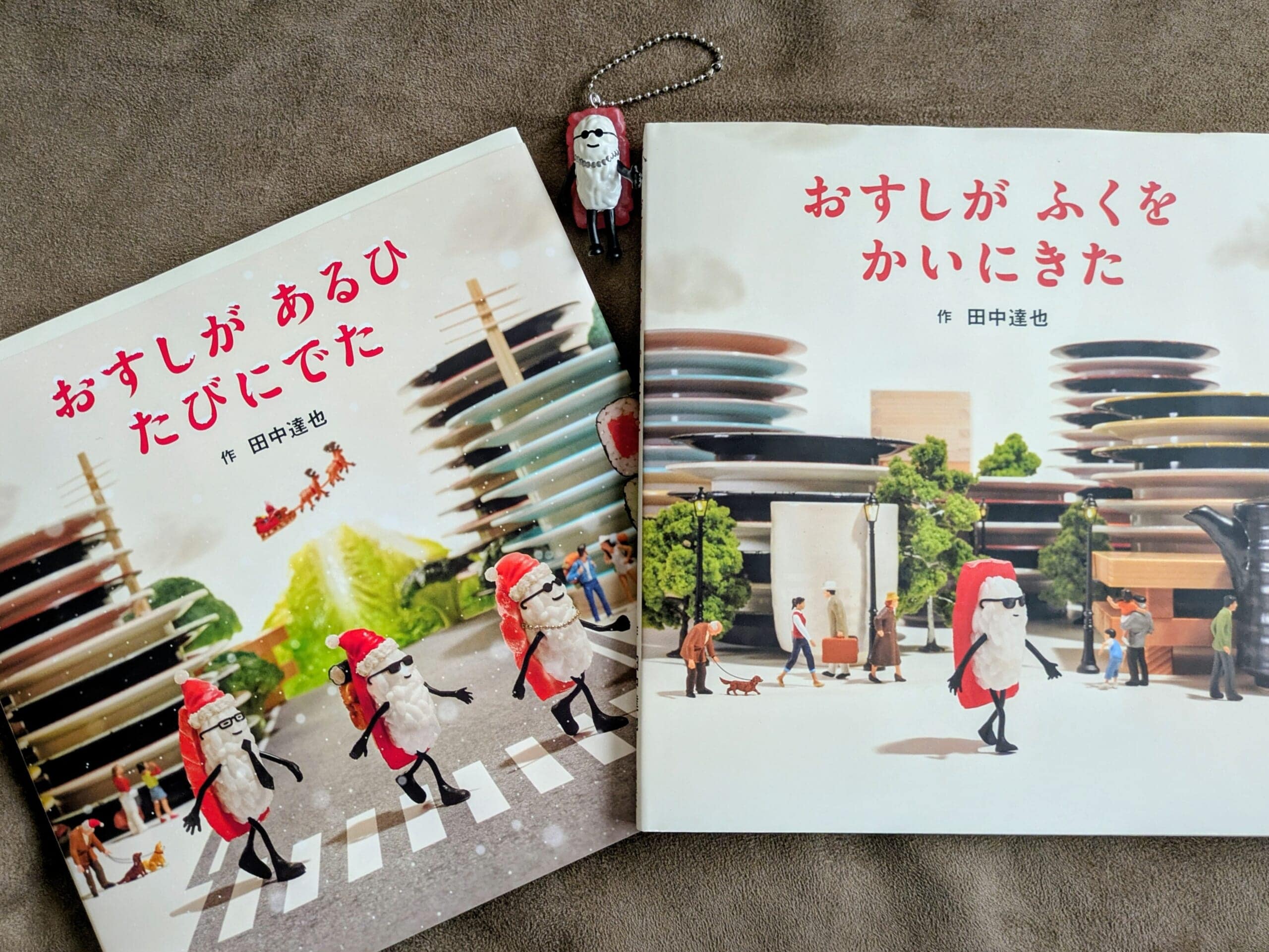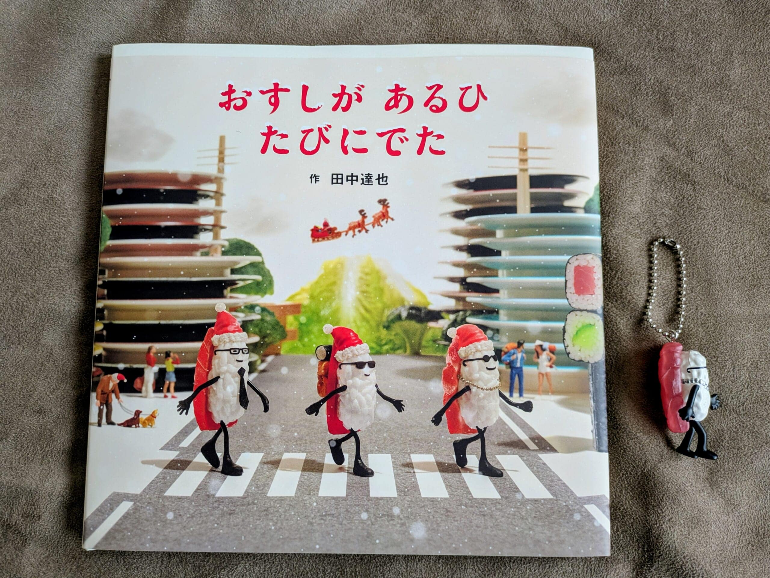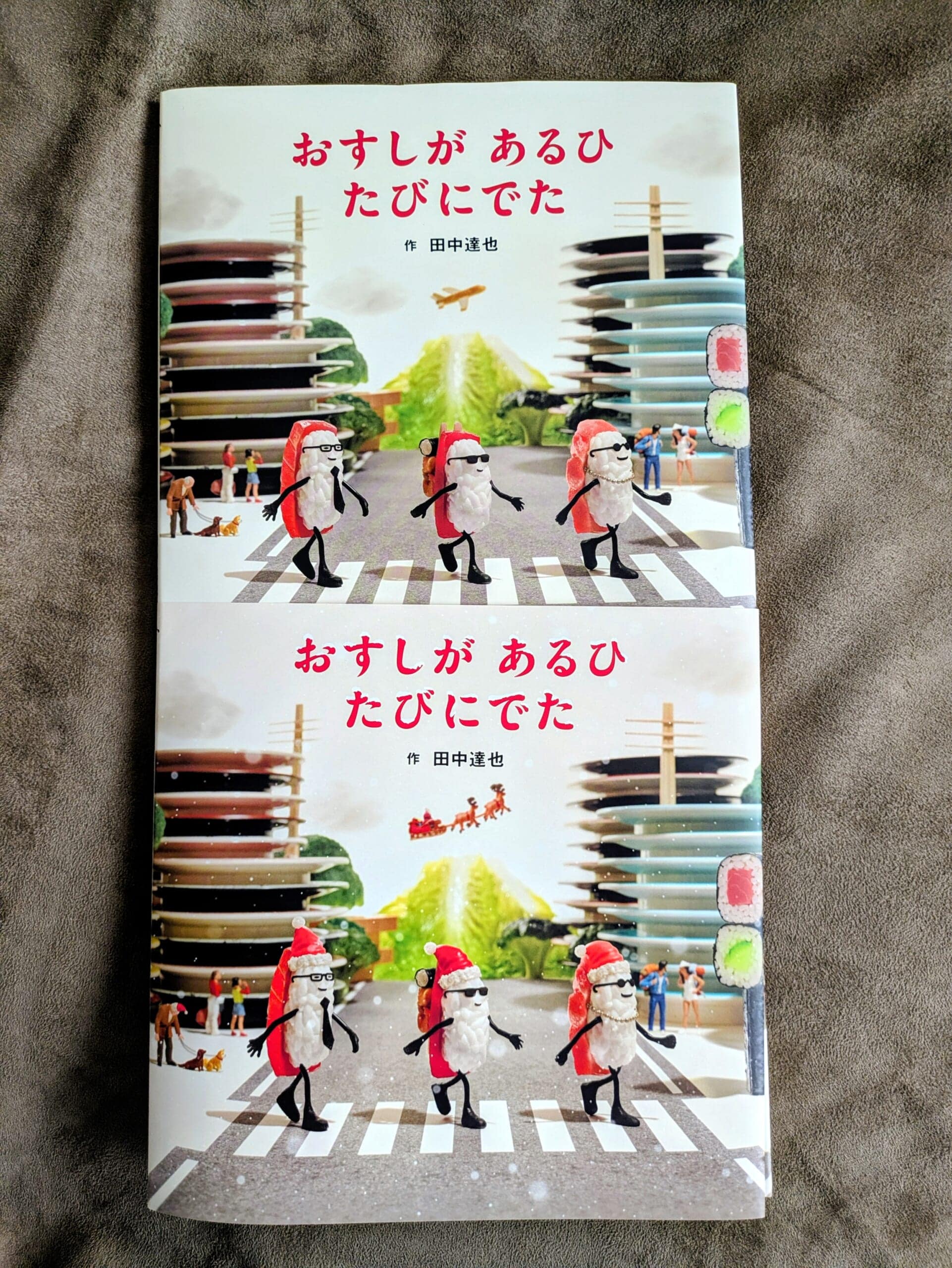 通常版と見比べると、飛行機がサンタさんとトナカイになっていたり、絵本のタイトルに雪がつもっていたり、田中達也さんのセンスがあふれています