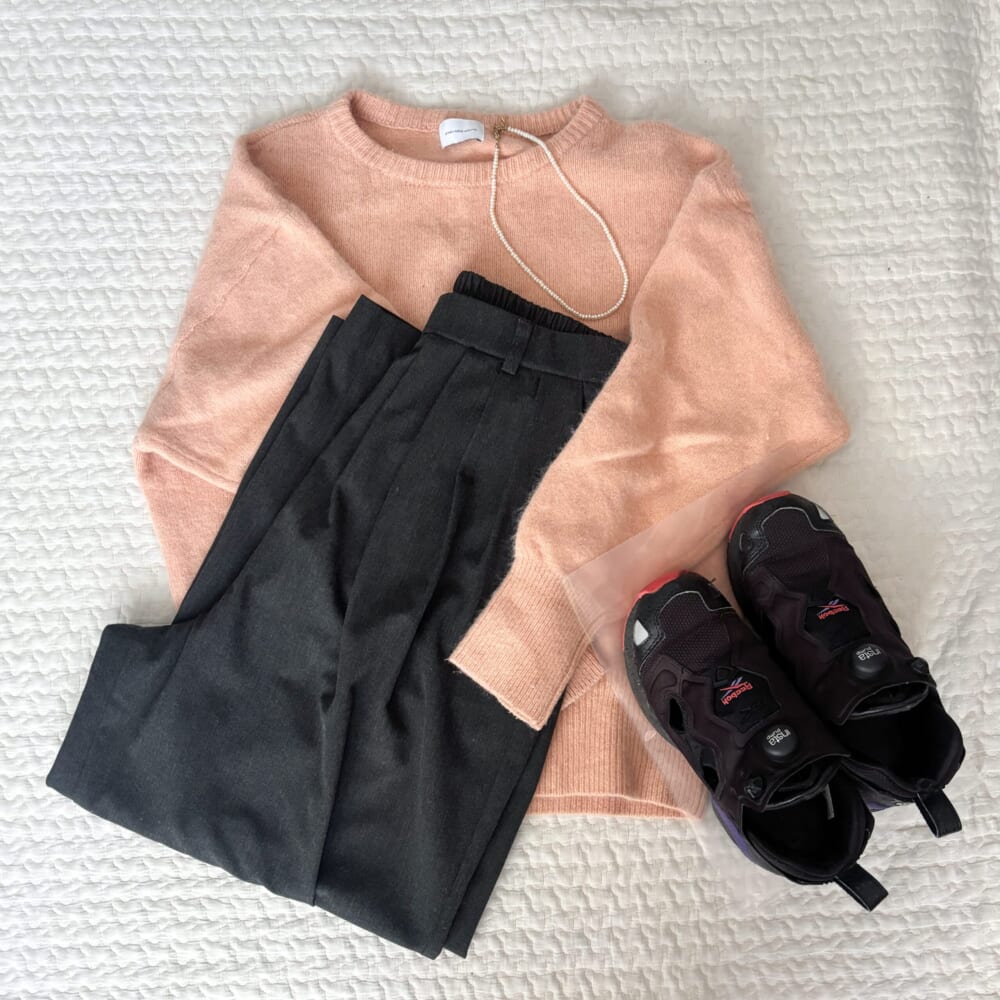 グレーのタックワイドパンツはカジュアル一辺倒な私の中ではきれいめ服。ラクーン混のふわふわのニットとパールのネックレスを合わせて少し華やかに。