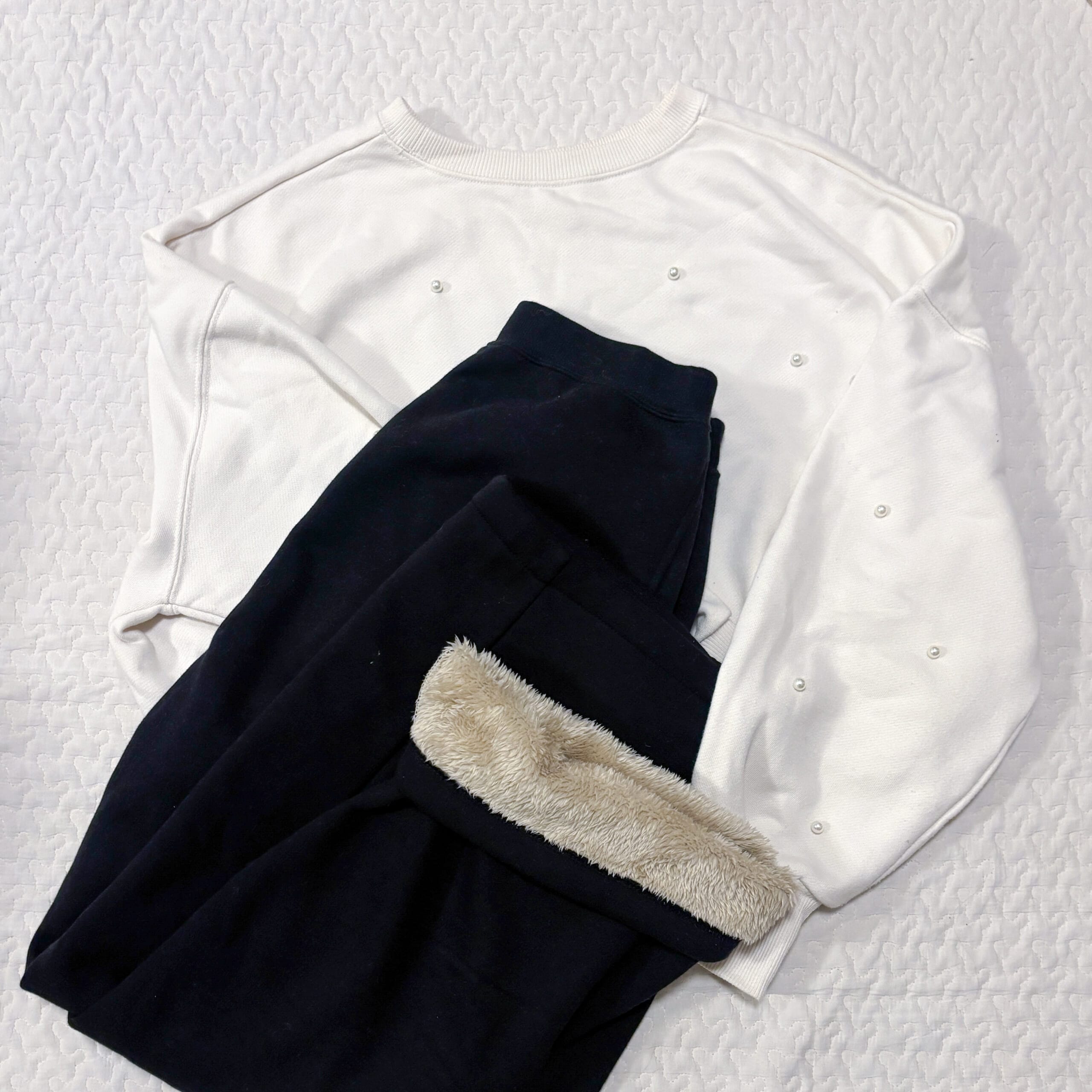 TBモミチさんのブログを読んでかぶり買いをしたユニクロGIRLSボアスウェットワイドパンツ。ボアがふわふわで気持ちよくてあったかくて毎日のように履いています。