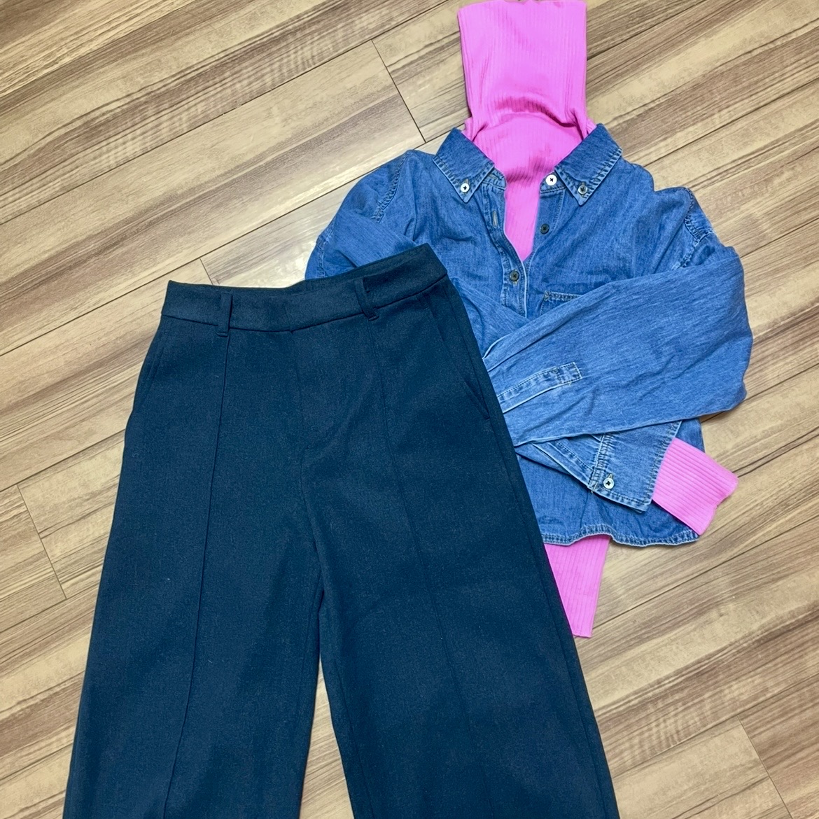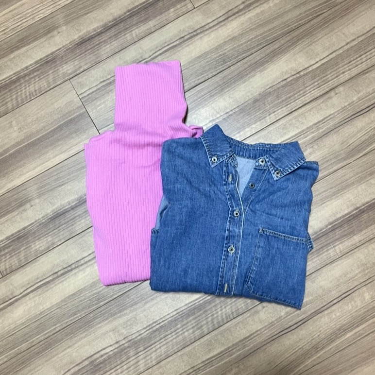 届いたリブニットのピンク色はとっても鮮やかでかわいい色!ですが、着こなせるだろうかと少し不安に…。結局、デニムシャツと合わせてピンクを差し色に使うことにしました。