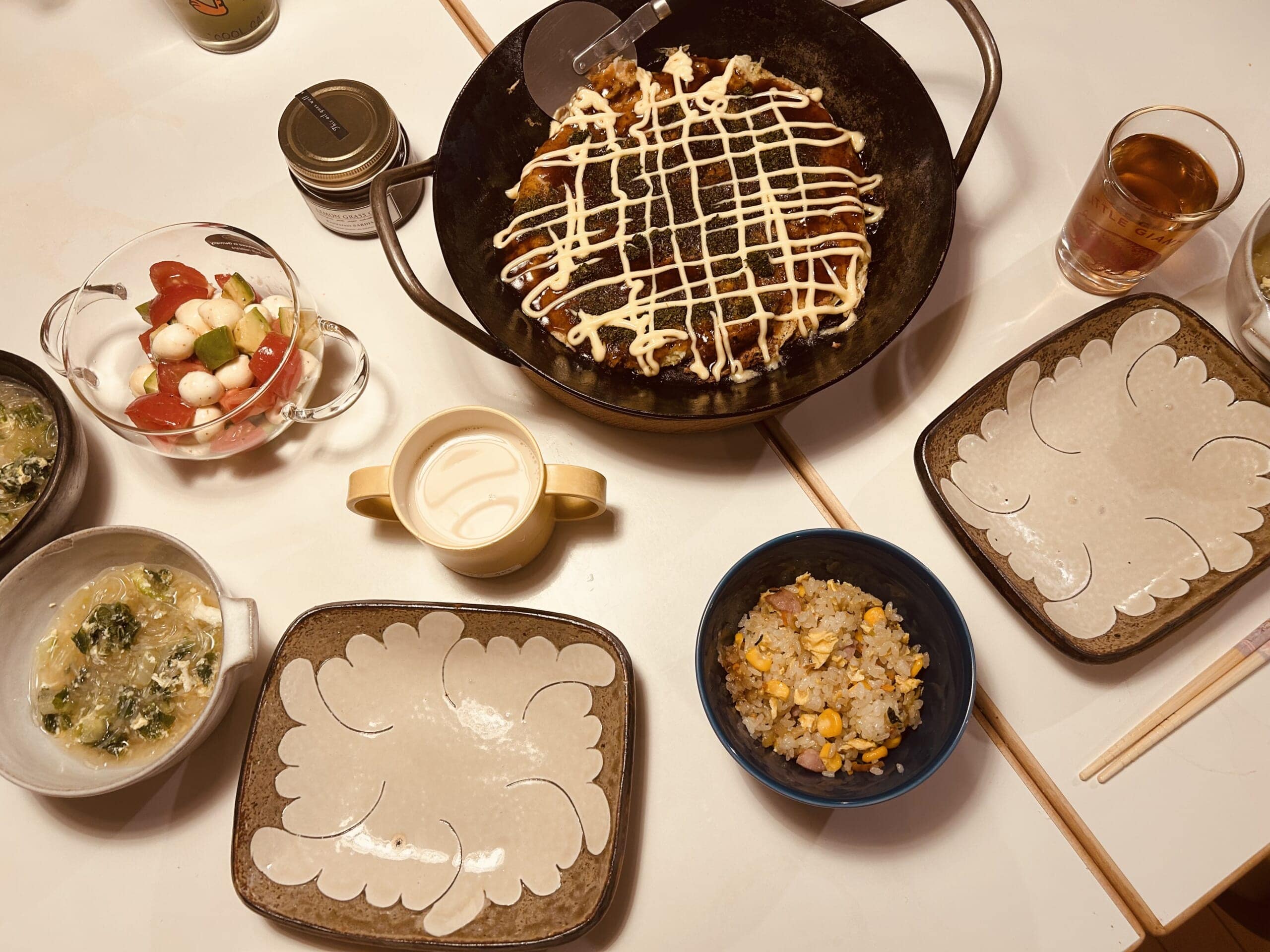 お好み焼きはキャベツと長芋をたっぷり入れて。普段使っているお好み焼き粉を切らしていたので、目分量で粉や卵を合わせて作りました。ちょっとゆるめの仕上がりになってしまい、お皿に移すと崩れそうだったので、タークのグリルパンのまま食卓に出してカット。