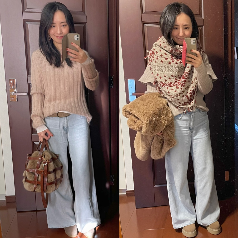 冬、くすみカラーのニットに合わせてマイルドなコーデに。