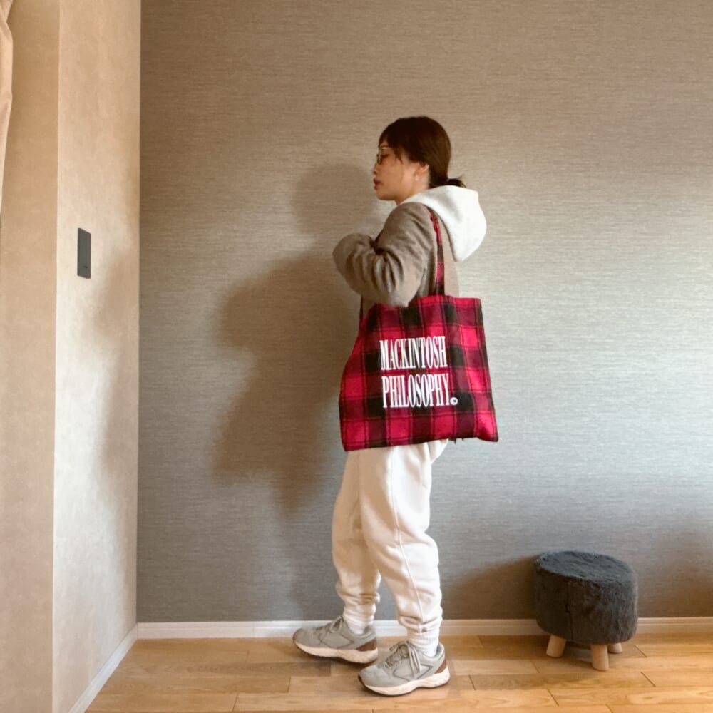 はいどーーーん。今月号は『マッキントッシュフィロソフィー大人のチェック柄BIGトート』とファンが多い『幸せをよぶ花ごよみ』が付いてくる。このチェック柄BIGトートがコーディネートの差し色に最高なので手持ち服に合わせてみました。