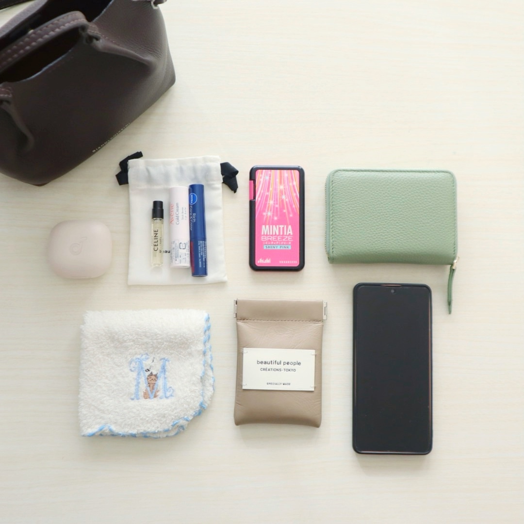 スマートフォン、財布、キーケース、タオル、イヤホン、リップを入れた巾着などが収まります。