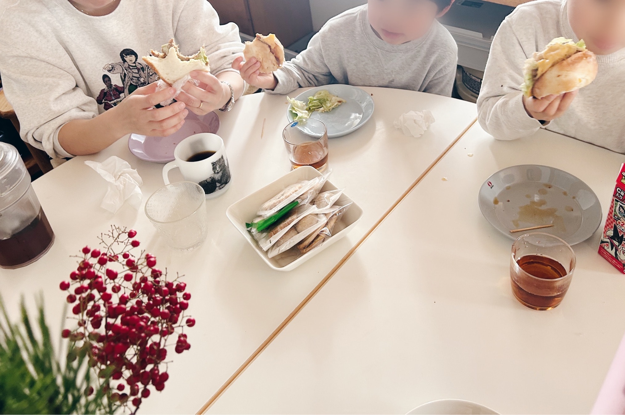 そしてコーヒーと甘いもの。母たちがおしゃべりをしている間、子どもたちはいつの間にかおやつを食べまくっていた…。
