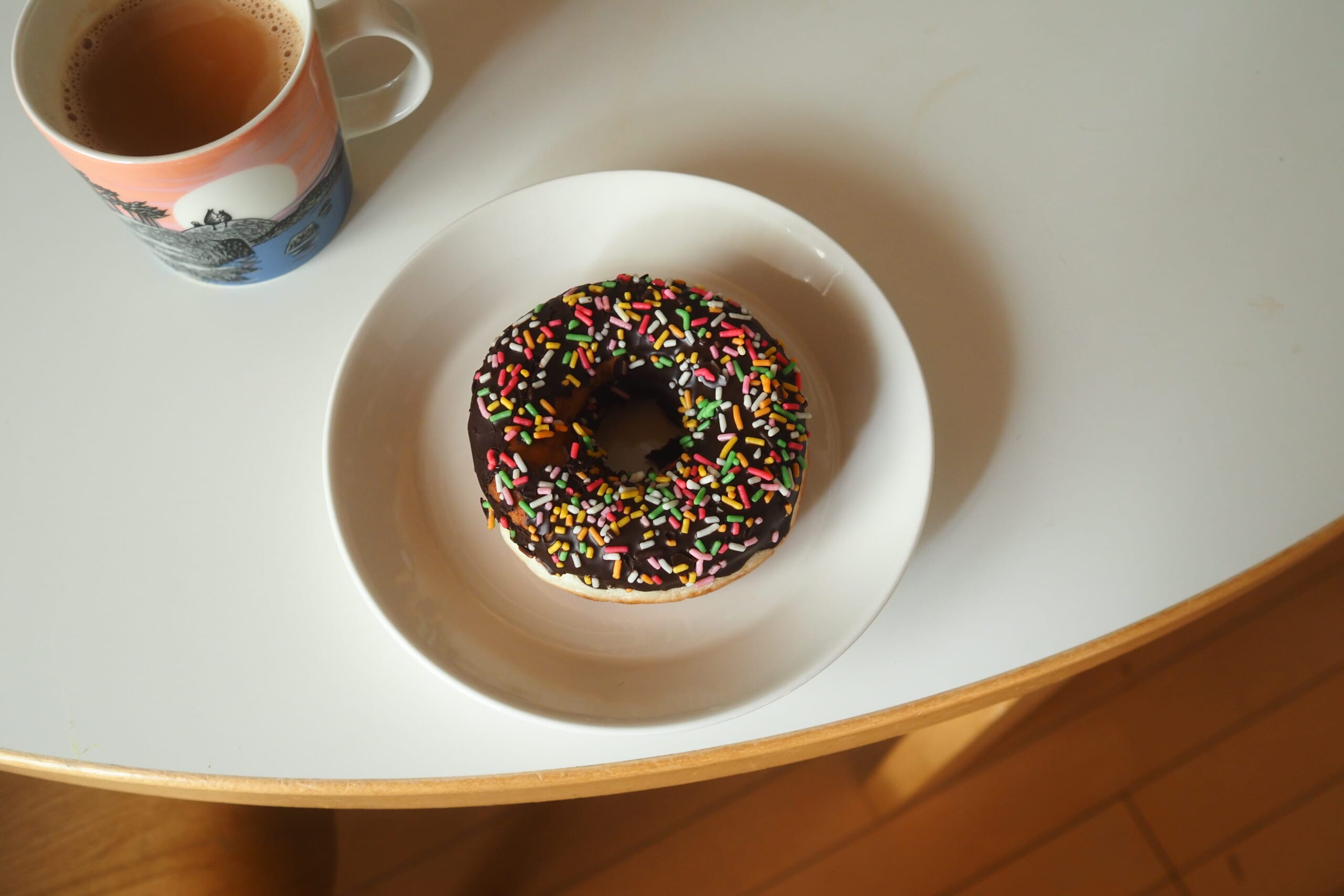 朝おやつにと思って用意したドーナツ。けど、ミルクティーを飲みながらブログを書いていたらお腹いっぱいになって食べられず…。子どもたちが半分ずつ食べることに。