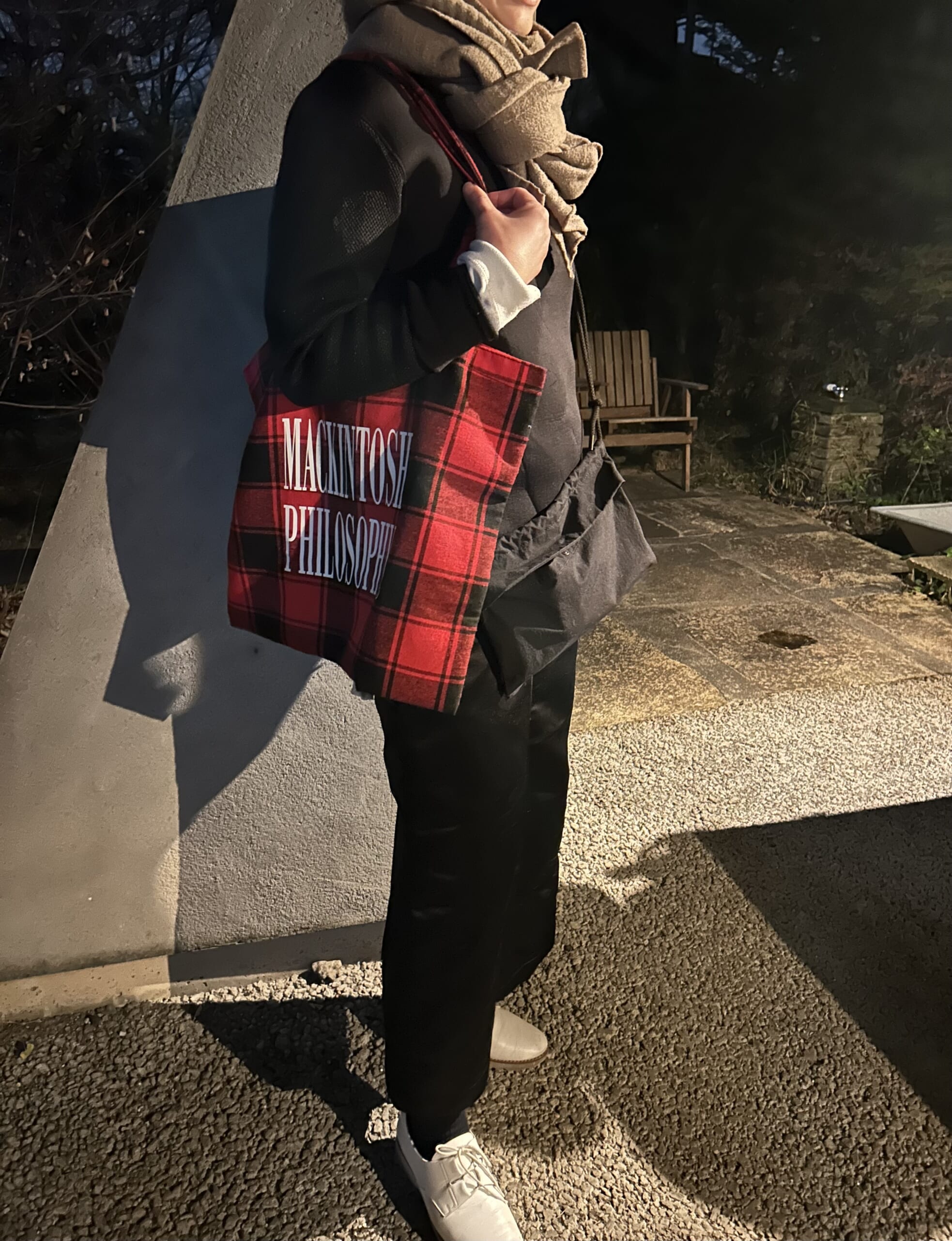 私のコーディネートは安定の黒づくめスタイルに赤チェックのビックトートがアクセントに。