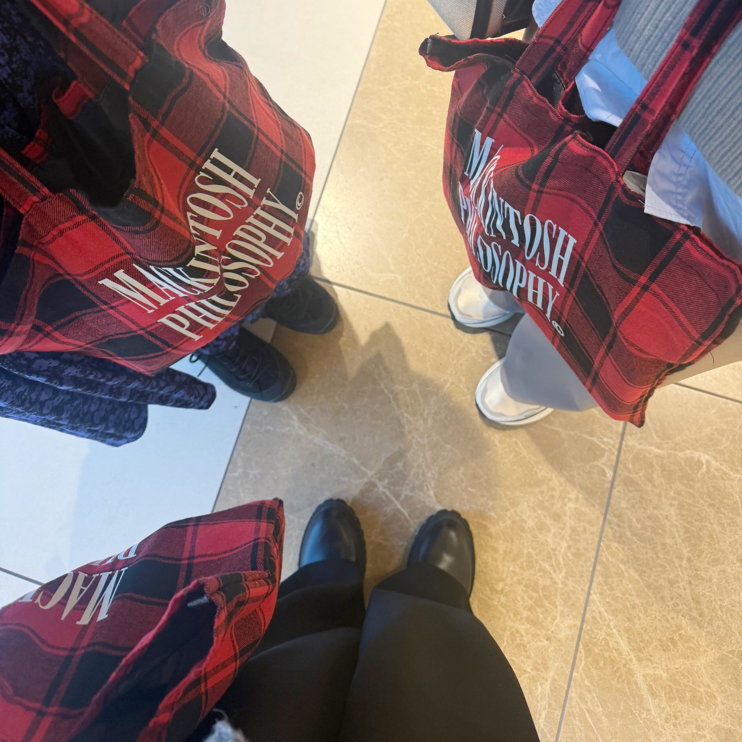 打ち合わせなしで3人が持っていたこのバッグは、LEE1.2月合併号の特別付録マッキントッシュ フィロソフィー×LEE『大人のチェック柄BIGトート』