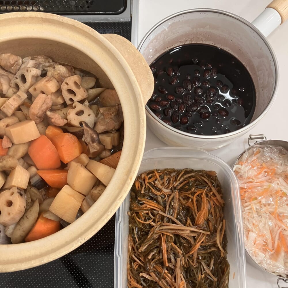 黒豆と筑前煮は大好きな栗原はるみさんのレシピでと決めています。昨年、黒豆を食べきれなかったので、今年は100gだけ煮てみました。ちょびっとずつ暮らしに合わせて調整しつつやっていこうと思います。