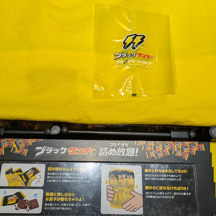 ブラックサンダー直売所の一区画で行われる詰め放題。工場見学予約者じゃなくても入れる直売所なので、こちらでお買い物をしながら【詰め放題イベント】を待つのもいいですね。全国各地で限定発売しているブラックサンダーがここなら購入できるのも嬉しいポイントです。