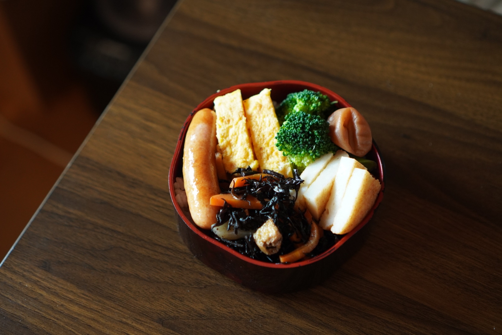 そしてこのアイデアのおかげで2段あるお弁当箱を1段だけ使えばいいのだという結論に至り(2段だと量が多くなるし、おかずをたくさん作らないといけなくなるので)、できたのがお弁当箱にごはんを広げてその上におかずをのせて完成!というパターン。