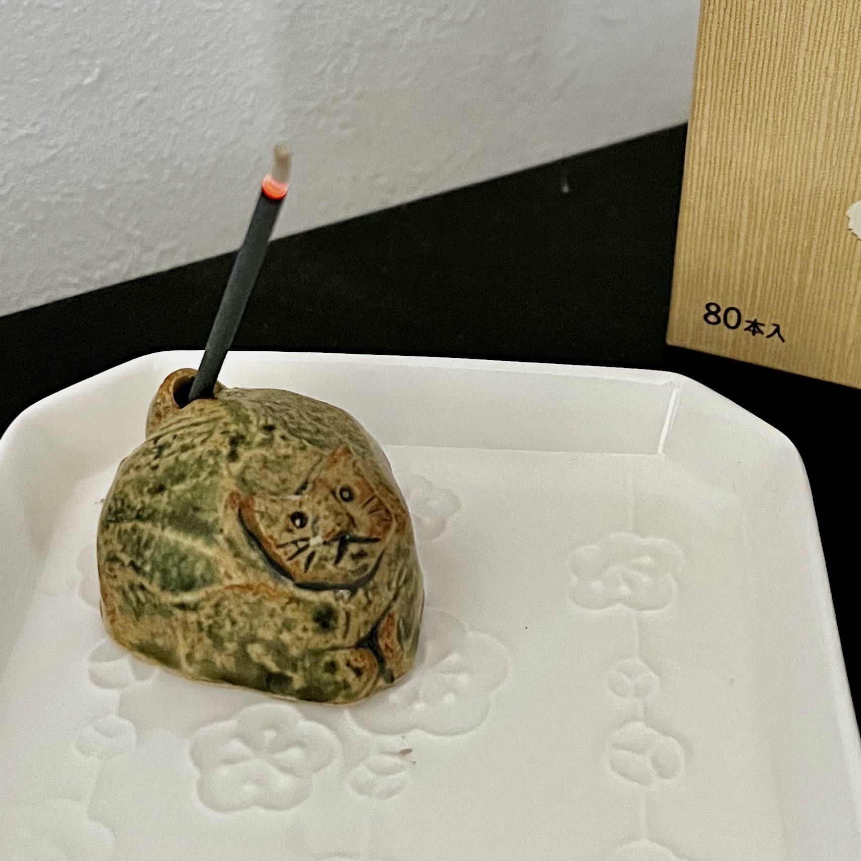 ↑お香立ては「赤水窯」さんのねこ!実家にあったのを拝借してきました。