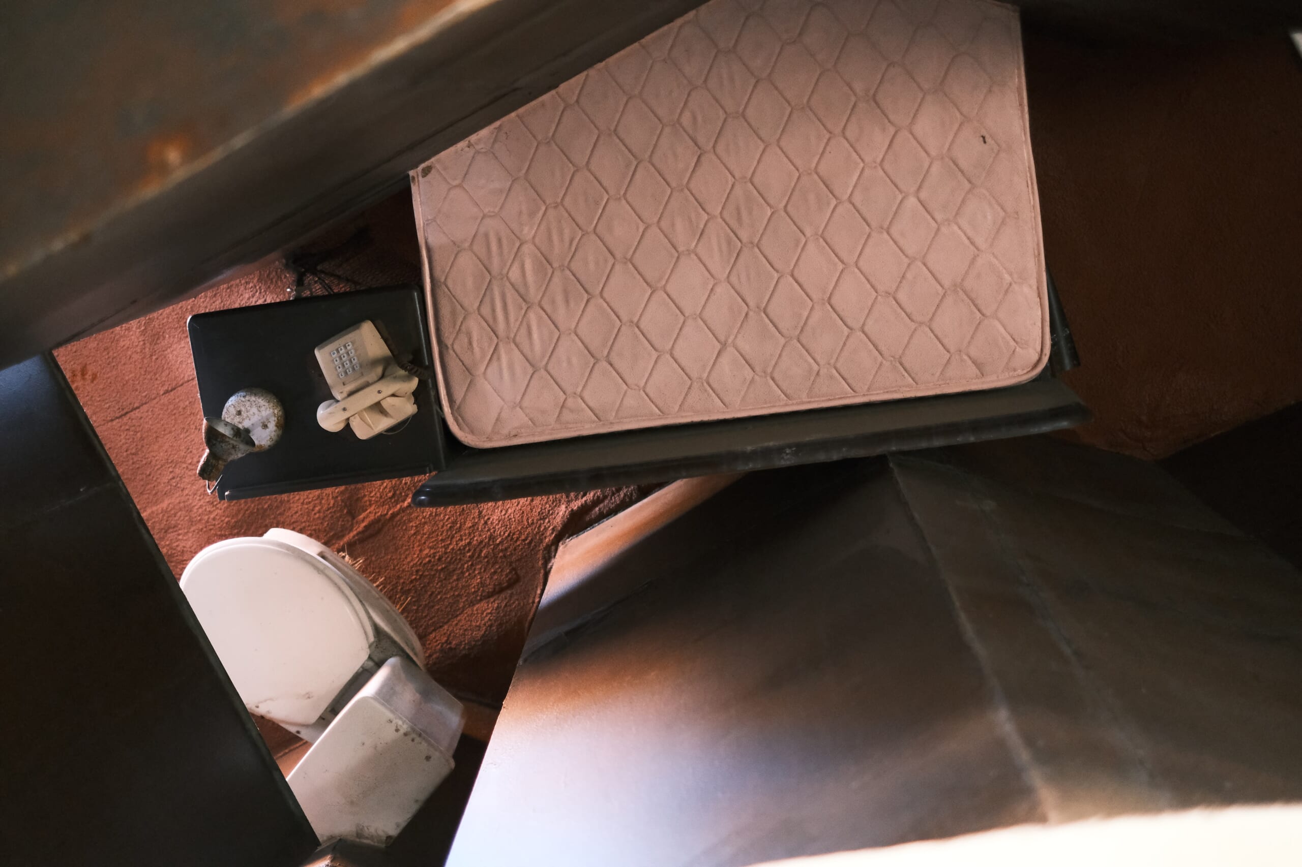 3枚目のベッドやトイレは天井の写真で、下にも同じ位置に同じものがあるんです。(あえて鏡にはしないこだわり!)