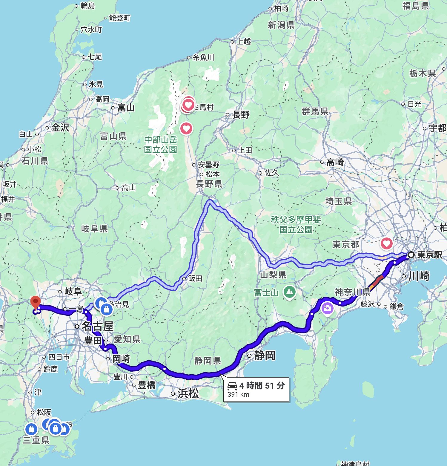 東京から多治見のルートは、長野県をまたぐ上のルートと静岡方面の下のルートがあるのですが、
