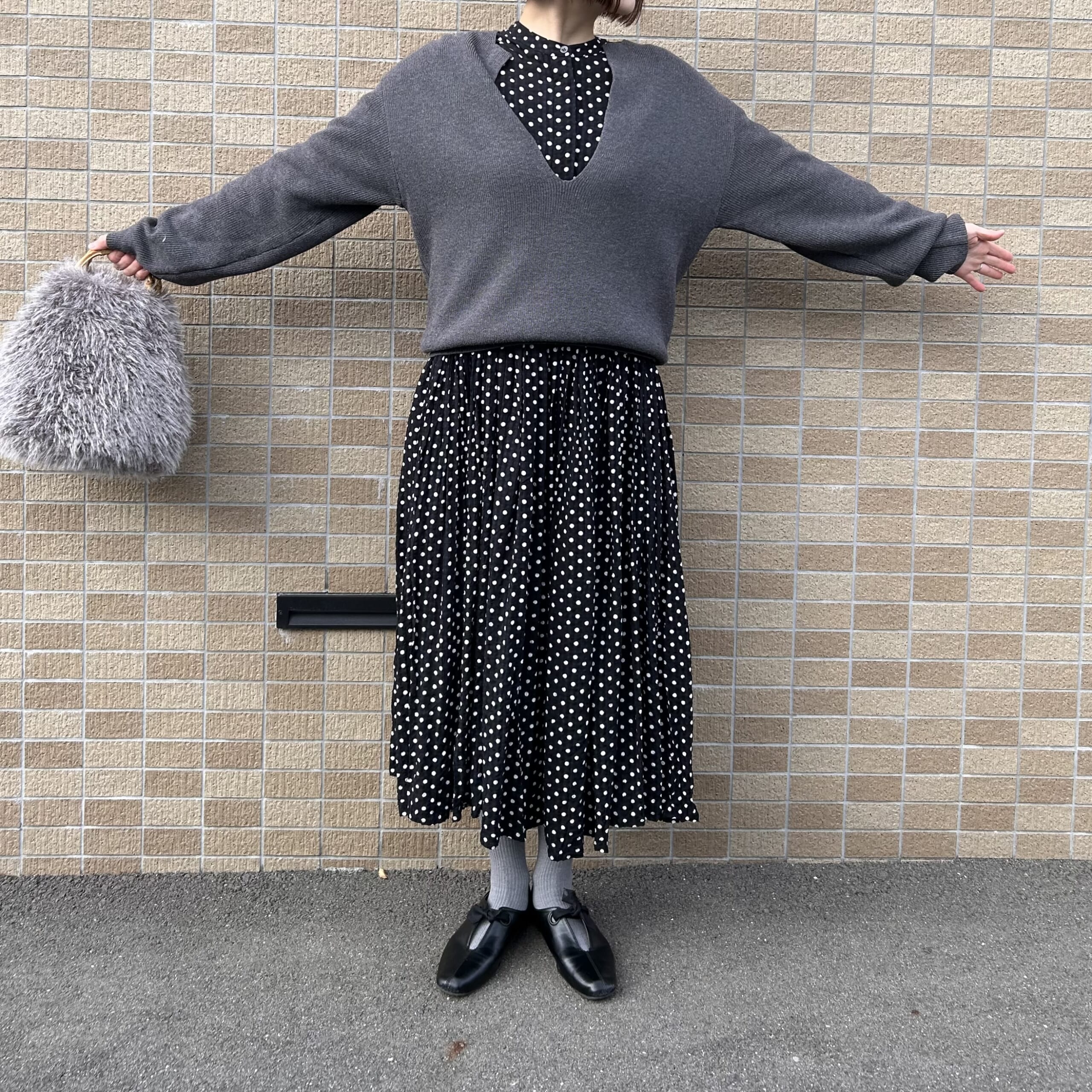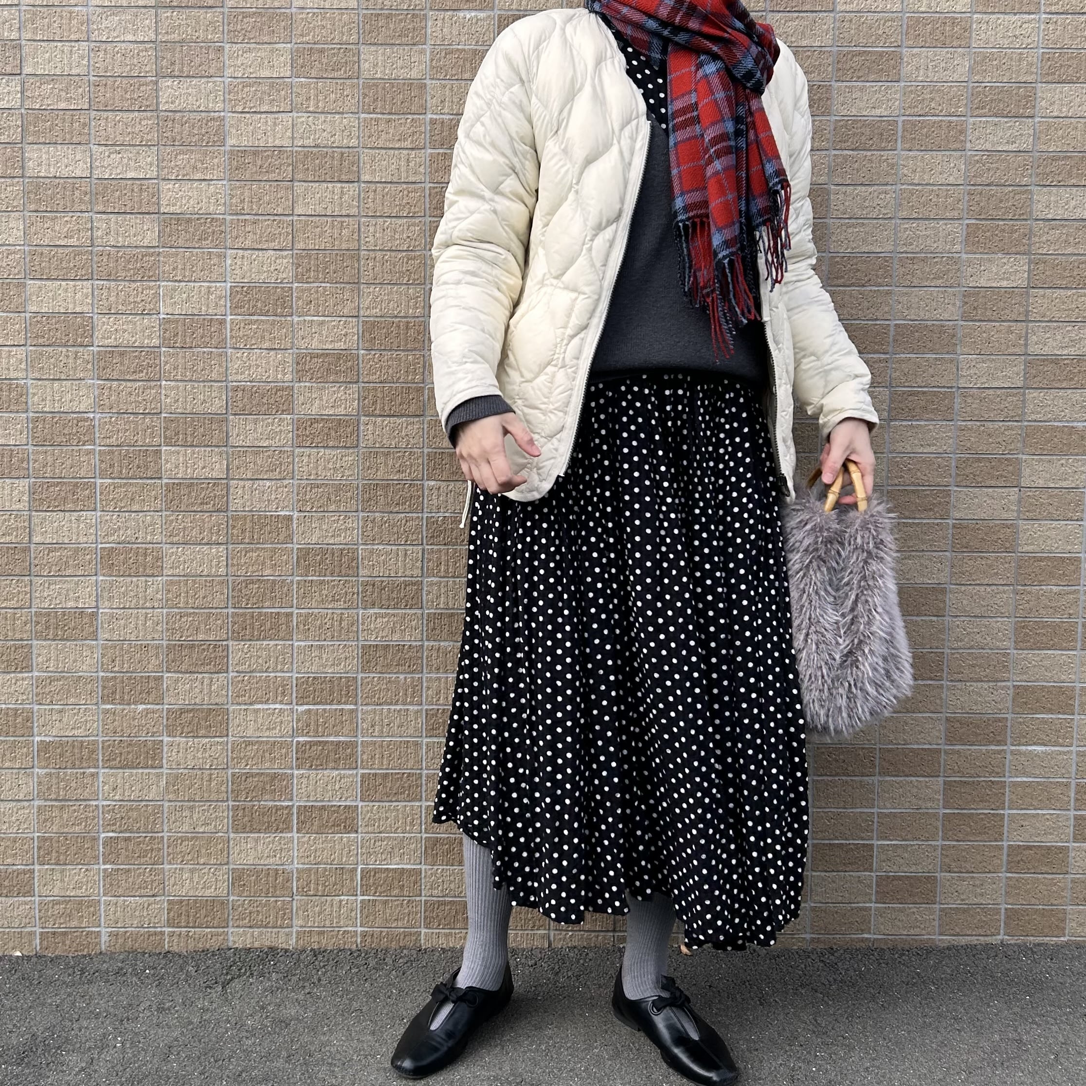 BEARDSLEYのワンピースにhunchのニットを重ねて、足元はヒートテックタイツとDOORSのリボン付きシューズにしました。車移動なのでアウターは軽めで。今季購入したTAIONのミリタリーラインです。アウターの中の方がガッツリ防寒しています。たくさん食べられるようにワンピース、そしてお手伝いできるように(したこと…アリマスカ?)腕まくりできる袖。