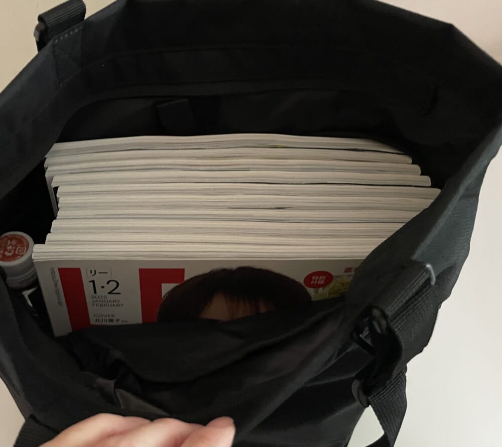 マチがたっぷりとってあるため、LEE1年分の10冊と500ミリリットルのお茶が入りますよ!!