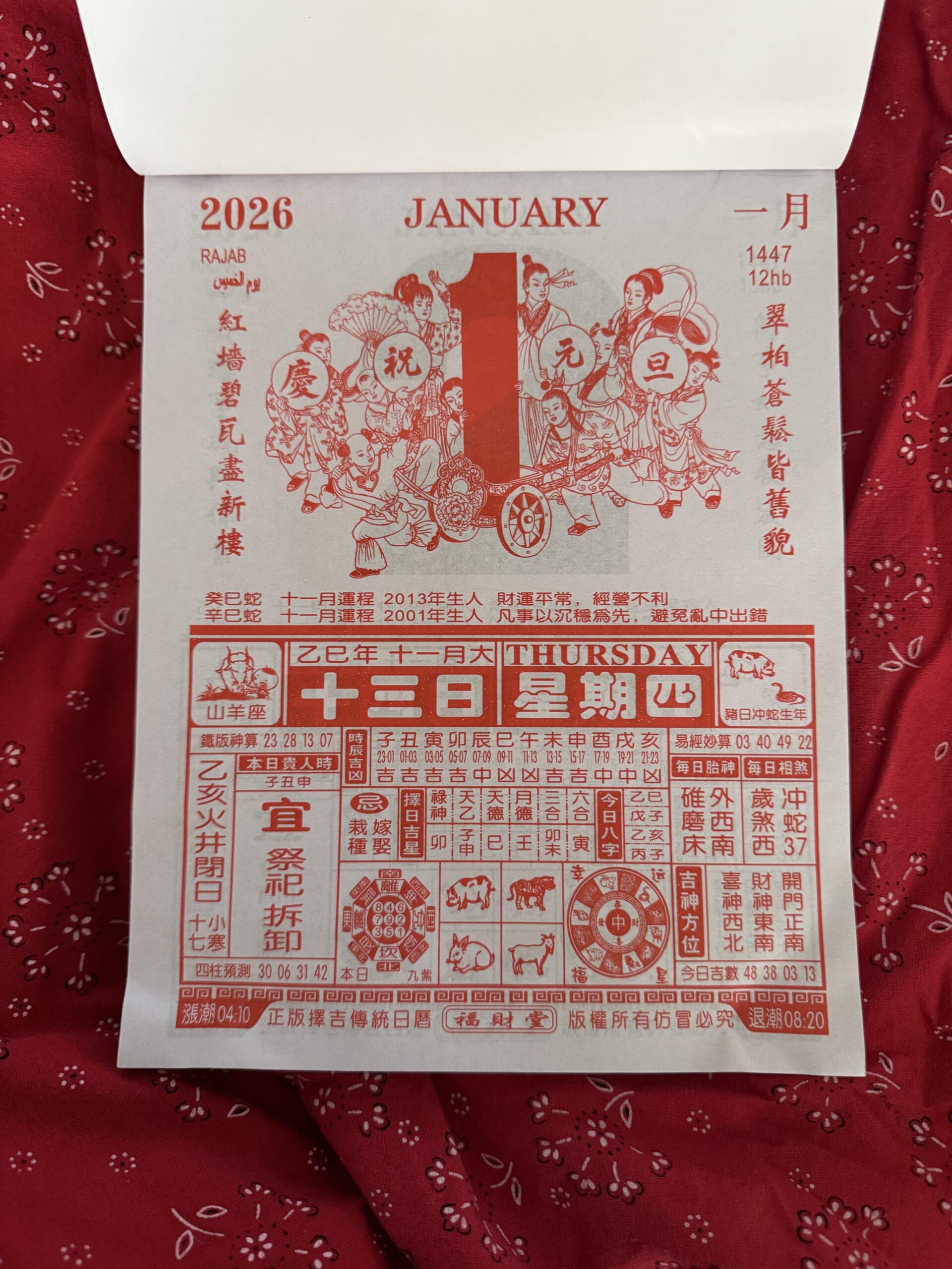 今年はこれにしよう!と即決したカレンダーは、中国人の方が普段使いように買うであろうスーパーで販売されていた日めくりカレンダーです。表紙からして縁起良さそう!何て書いてあるかわからないけどお金持ちになれそう😆