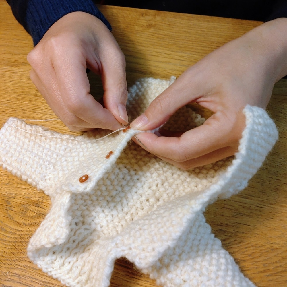 途中でボタンが飛んでいってリビングを捜索するアクシデントを乗り越え、完成しました。良~く見ると粗はありますけど、ヨシとしましょ。薄目で見てくださいませ。