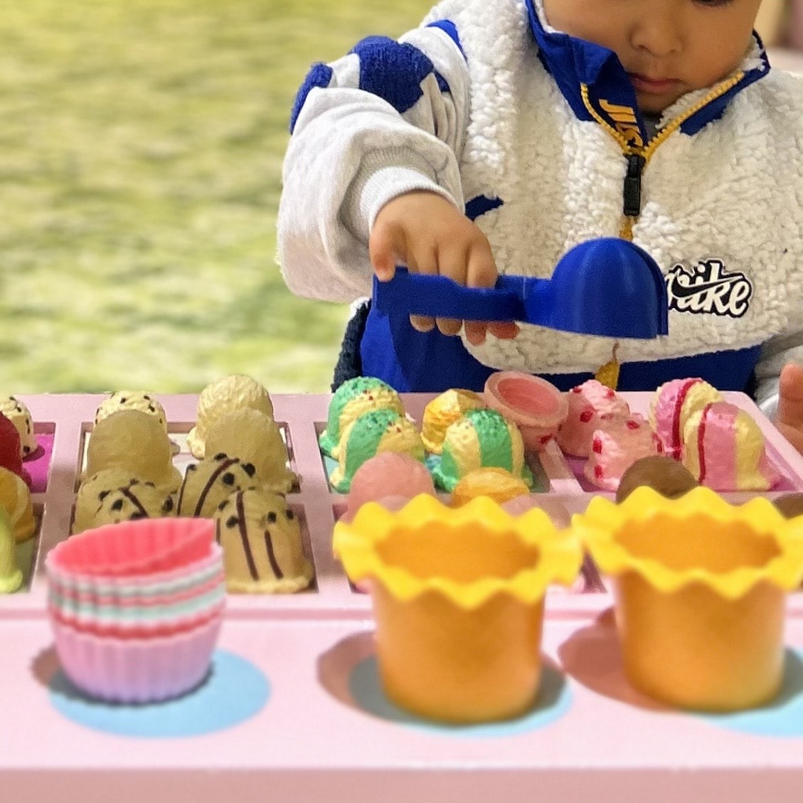 アイス屋さんごっこが一番のお気に入りだったようで、「いらっしゃいませ〜」「どのアイスにしますか?」「○円のお返しでーす」と楽しそうに遊んでました!