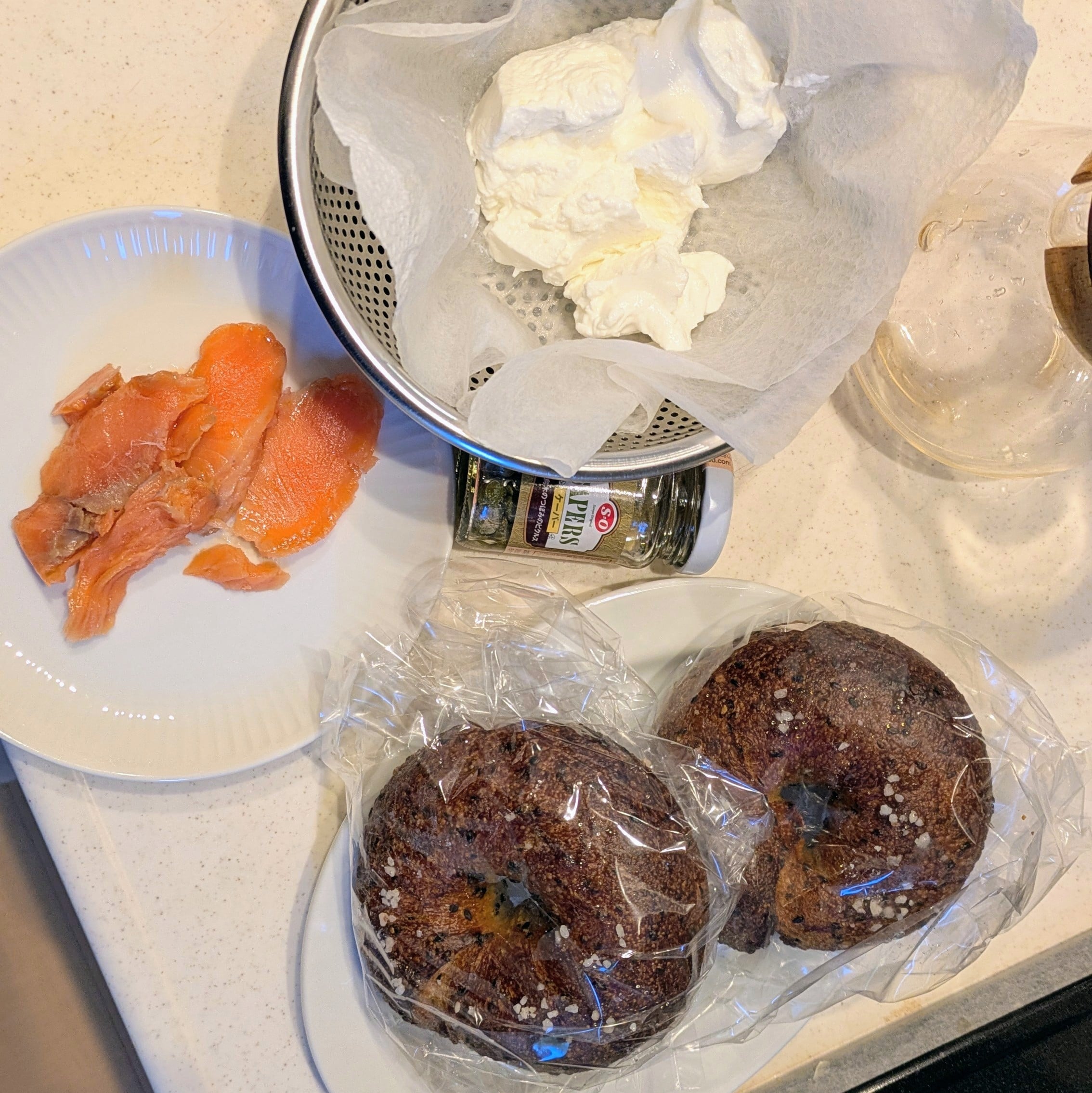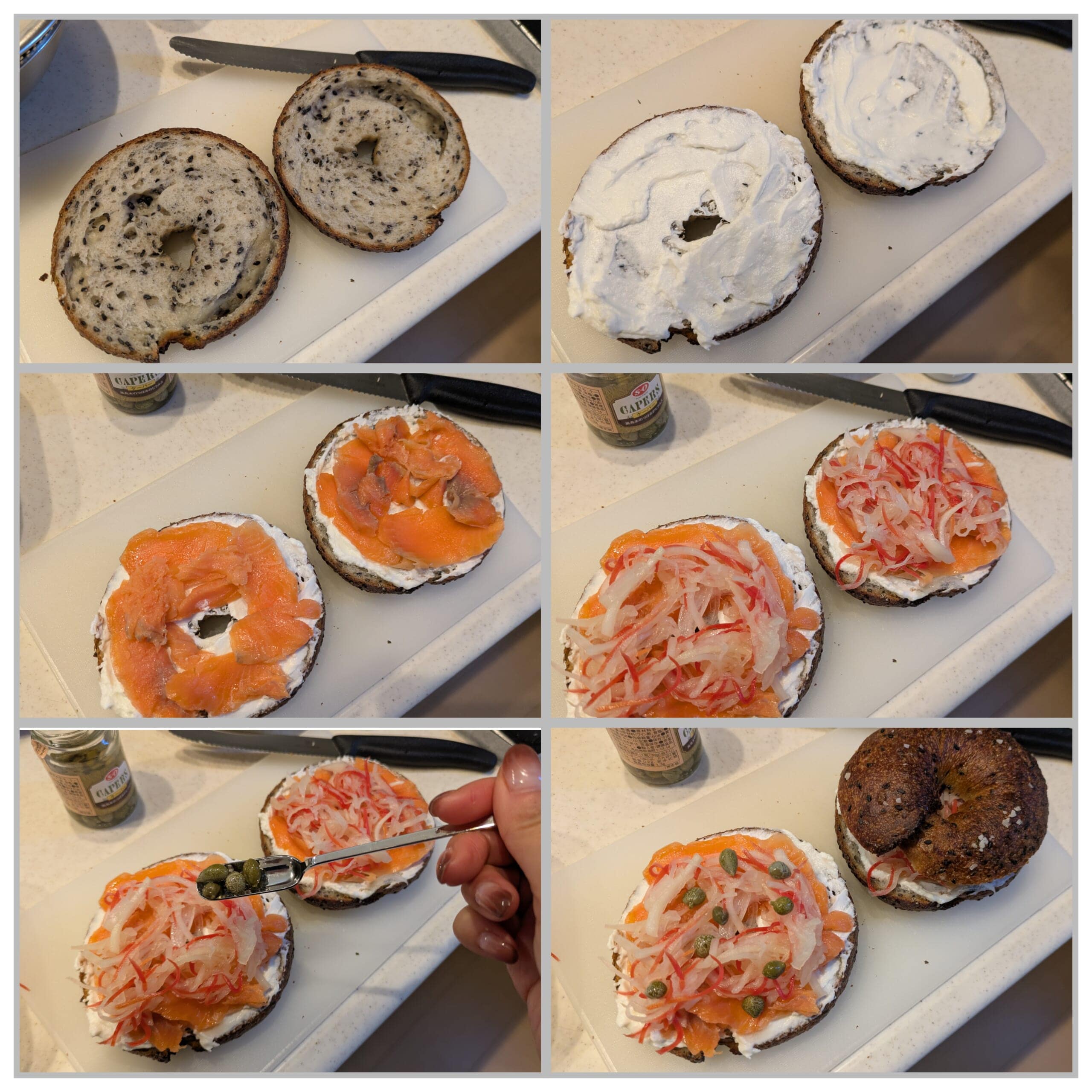 - ケーパーを散らす、上半分のベーグルをのせる