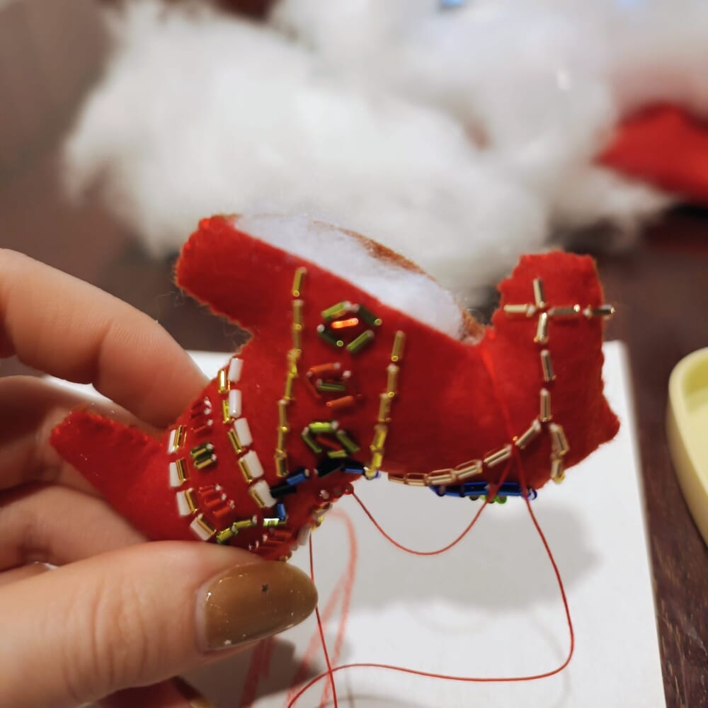 (ビーズを縫った糸をなぜか白にしてしまったのは後悔ポイント。赤にすれば良かった・・・)