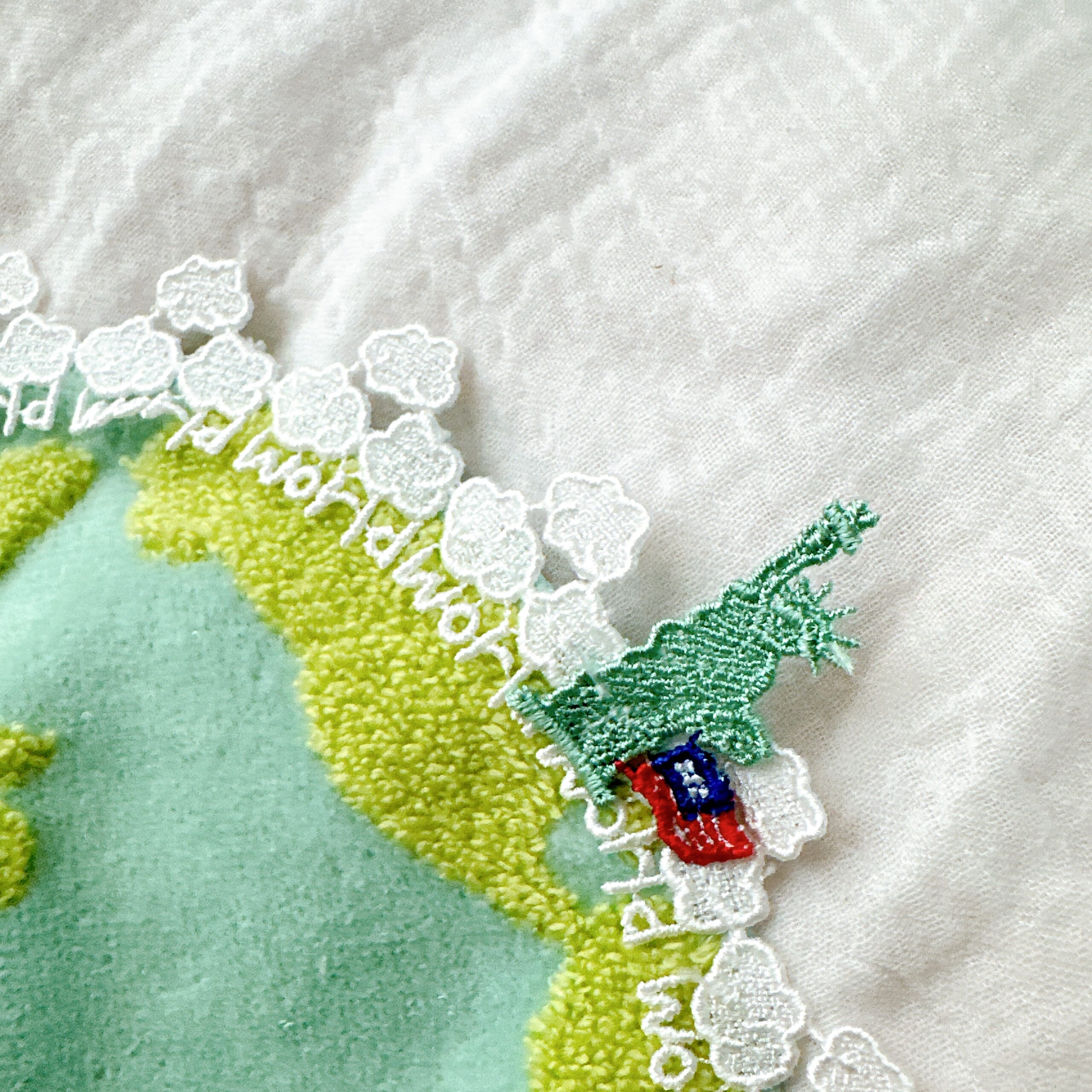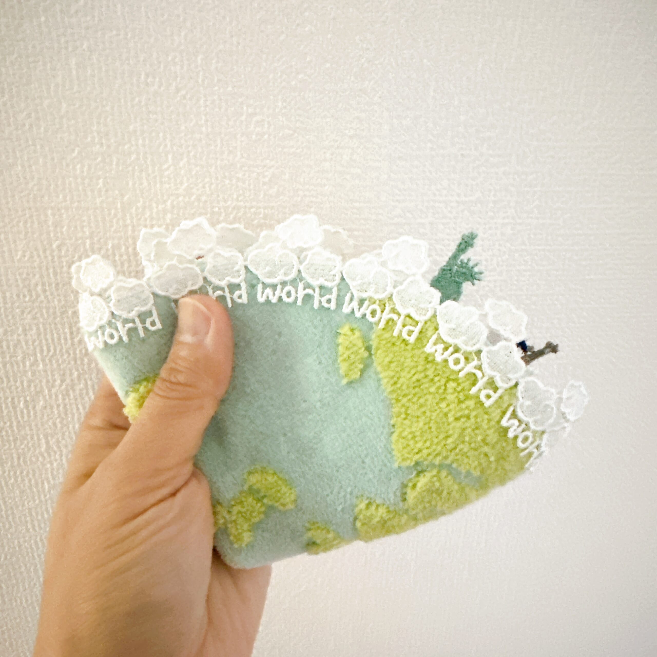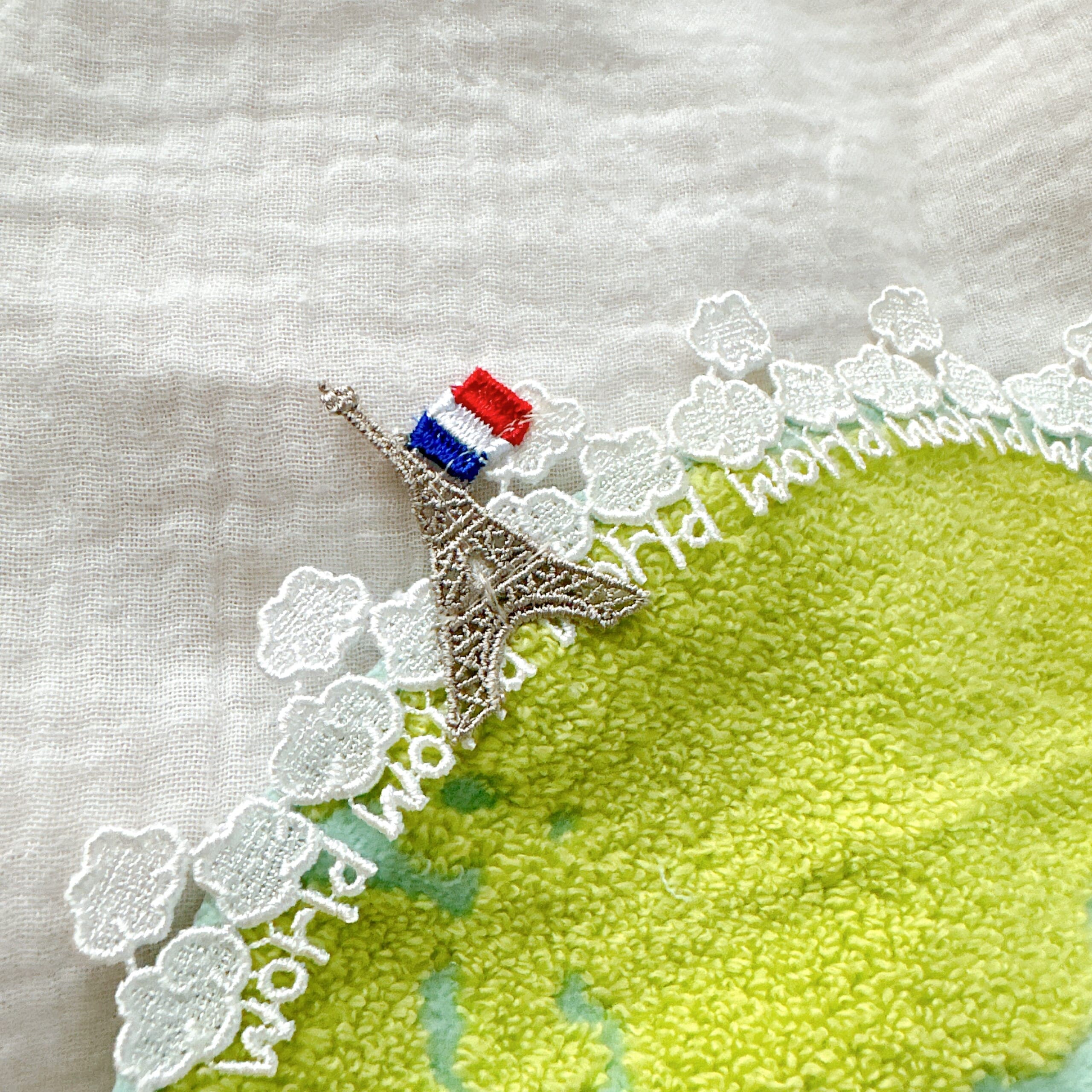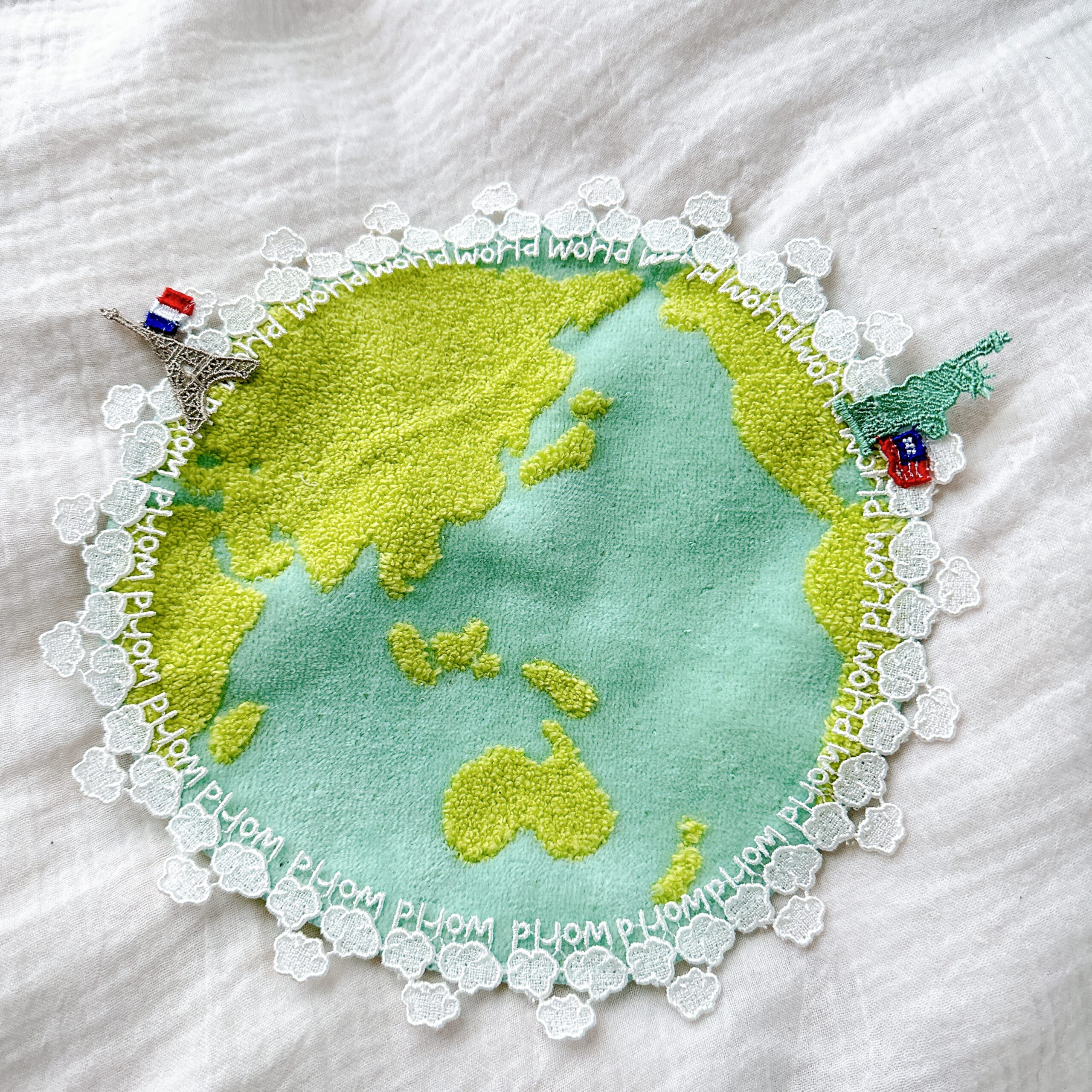 世界旅行テーマにパリのエッフェル塔、アメリカの自由の女神のレースの刺繍、そして円の周りにはもくもく雲と”world”の刺繍が並んでいます。