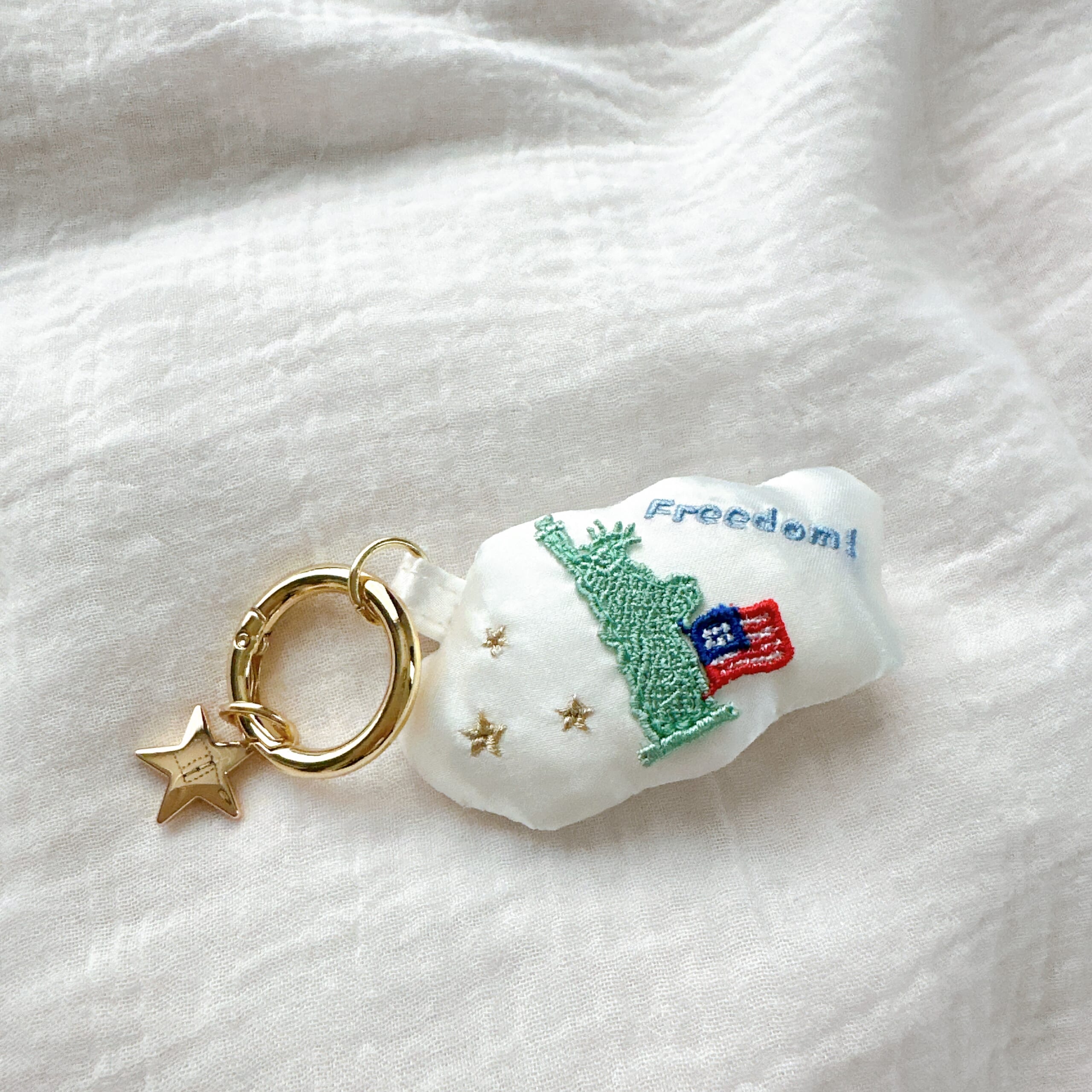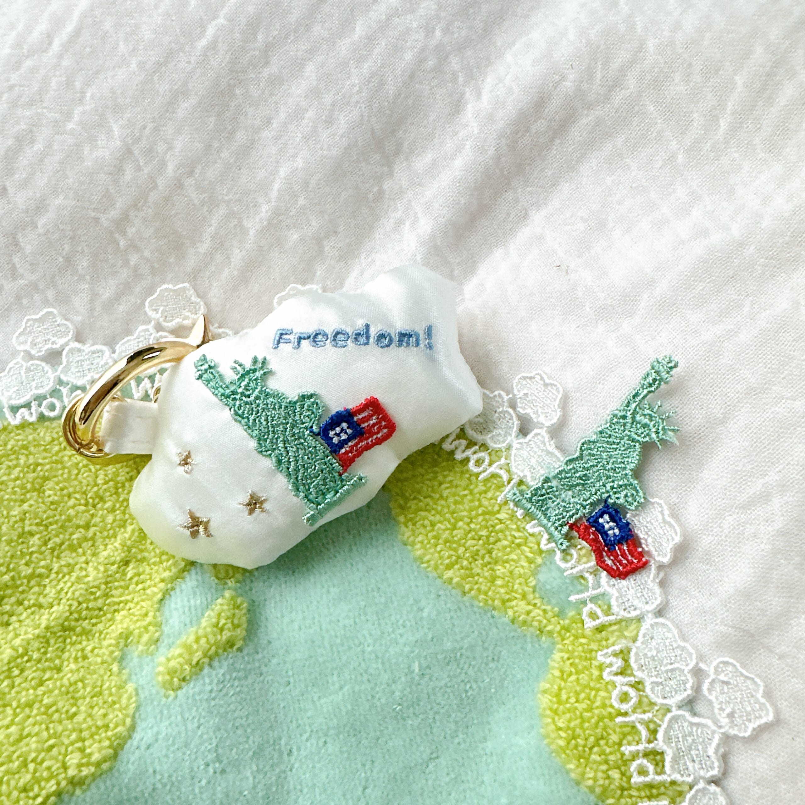 小さいクッションのような、もこもことした雲をベースに、タオルハンカチにもあしらわれている自由の女神と、”freedom!”の刺繍、そして星の刺繍が3つ。