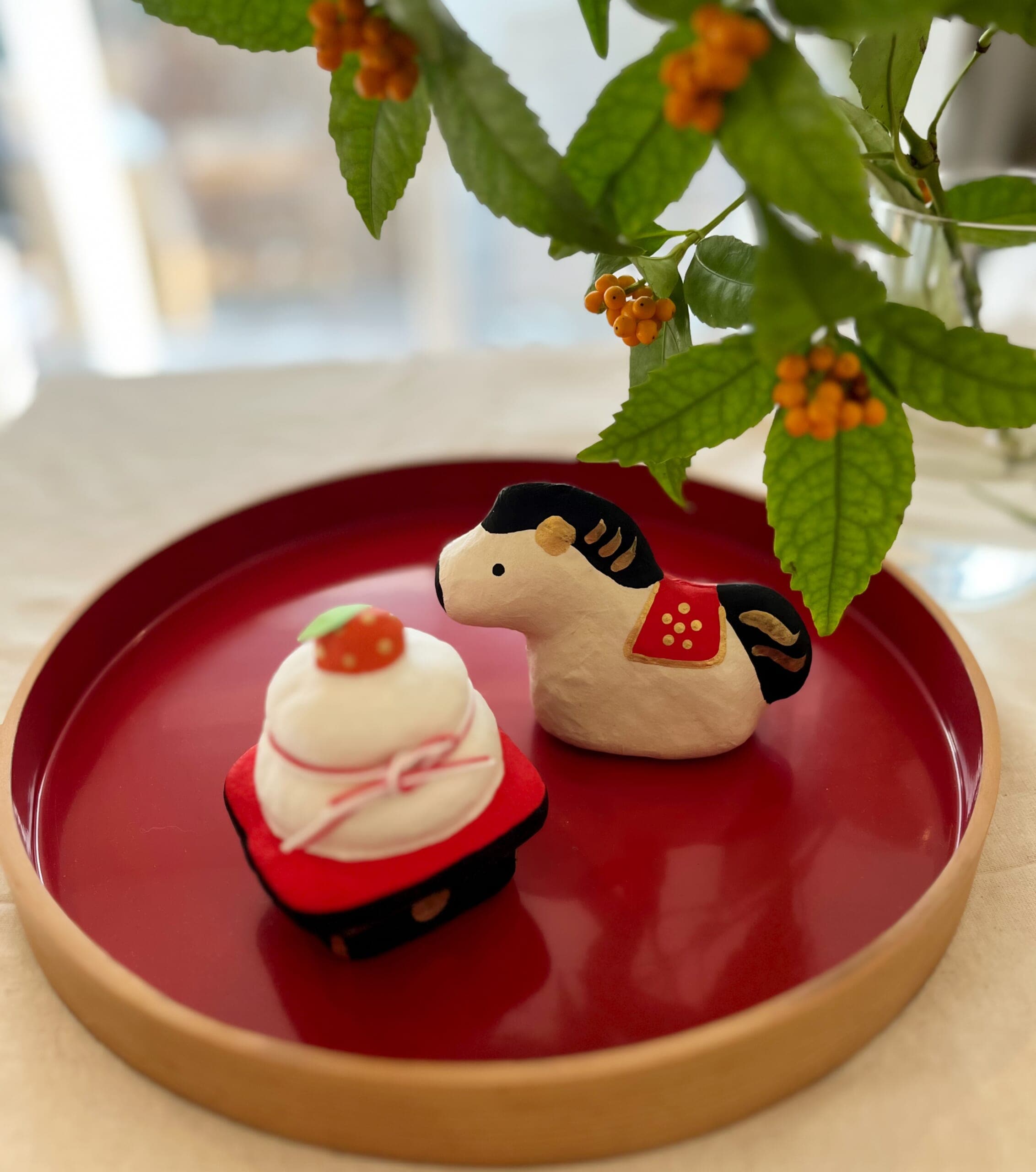 寅年の時にも伺ってかわいい虎のお面を買ったのですが、この日気になったのは、鏡餅と馬の置物。作家の手作り作品で同じものが二つとないのも魅力的。