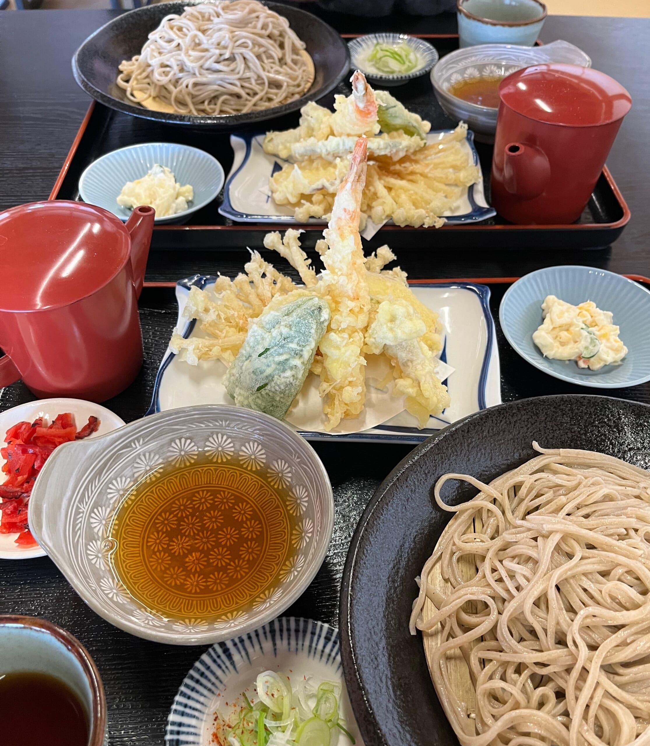 お風呂から上がると広い休み所で、母のお気に入りの天ぷら蕎麦セットを。このボリュームで1100円?!とびっくりなお値段。お蕎麦も手打ちの本格派で絶品!