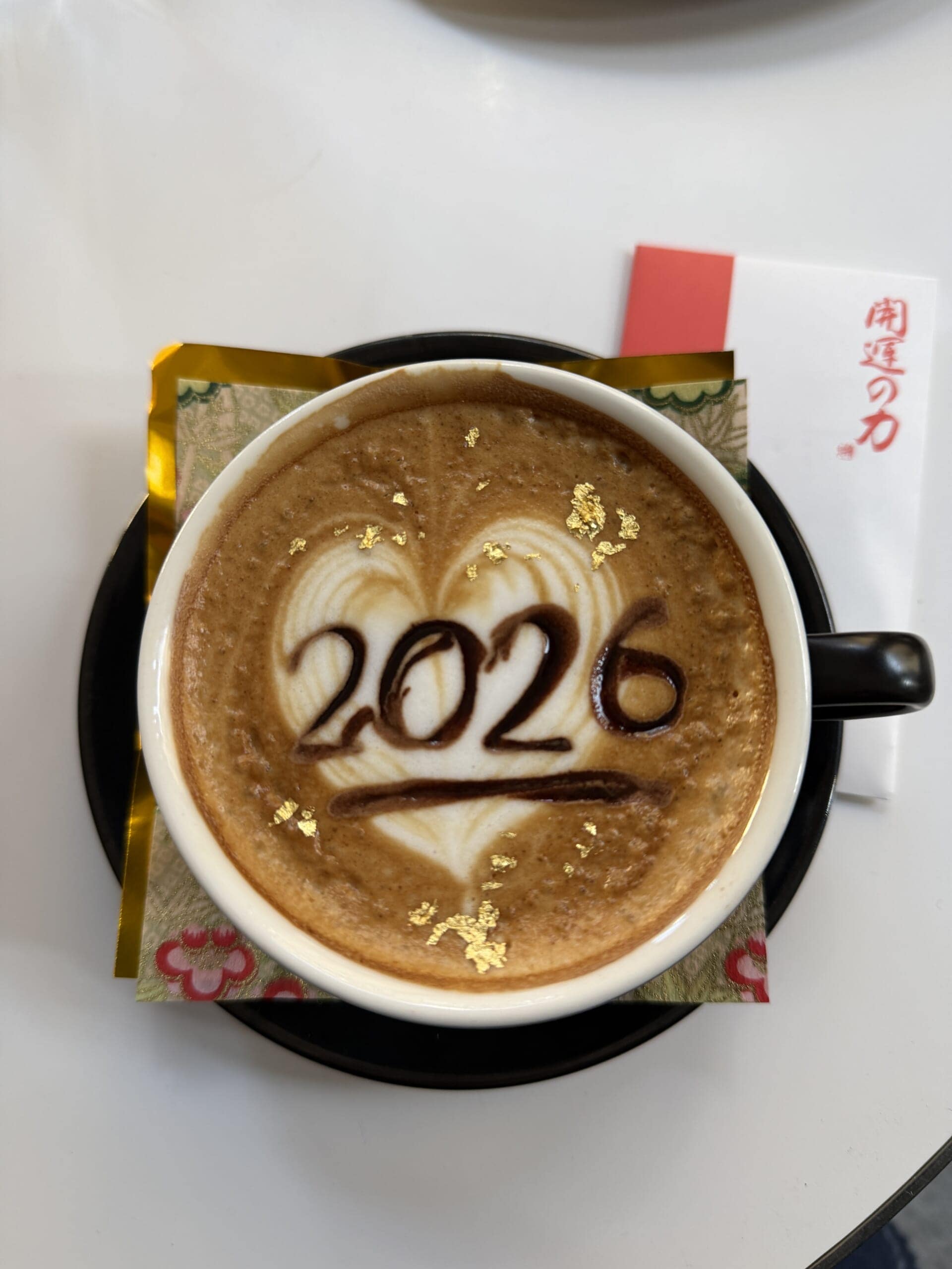 ふわふわのミルクフォームの上に、きらりと輝く金箔がのっていて、はチョコレートソースで「2026」の文字が!
