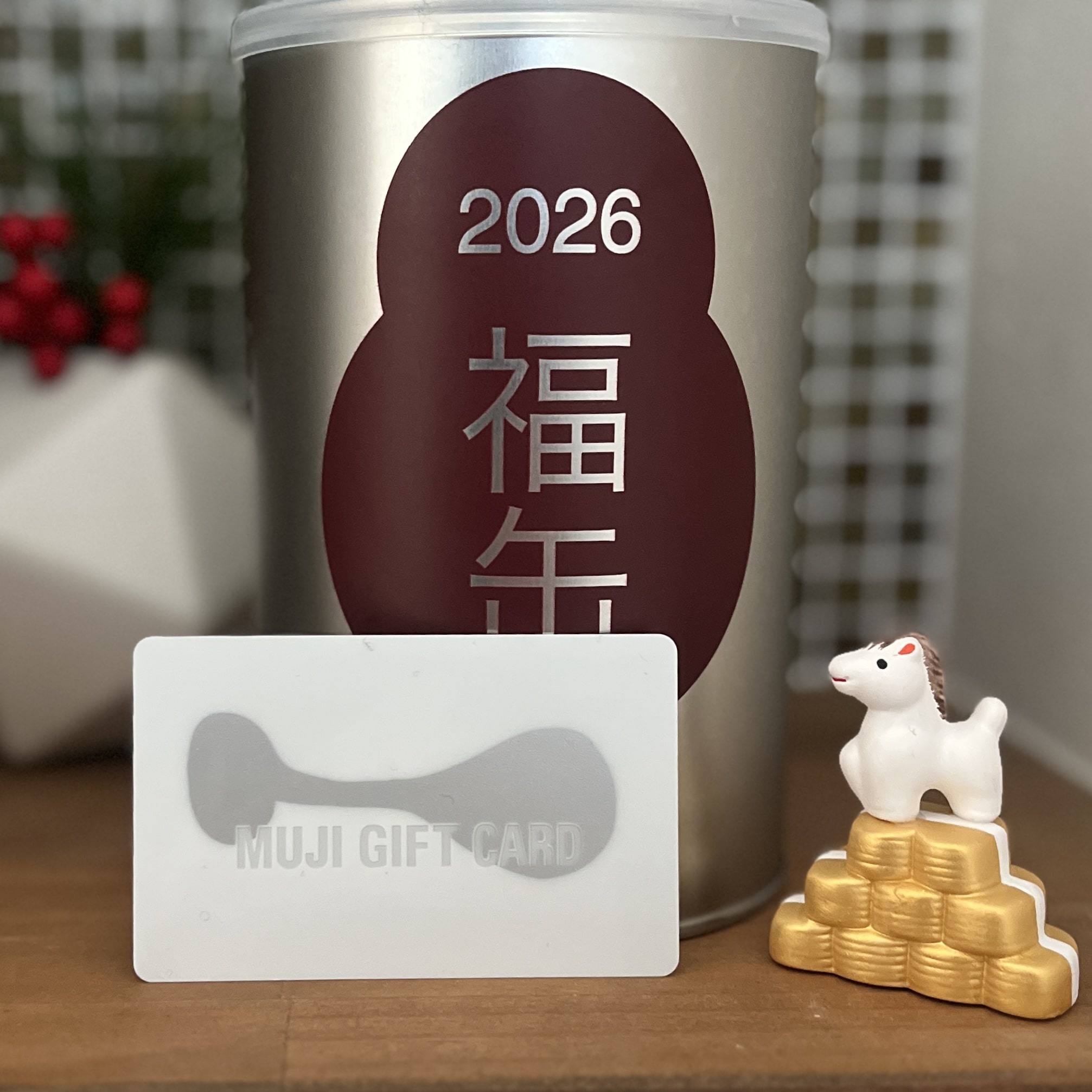 日本各地の作家さんや工房が手づくりしている縁起物が1つと、2,026円分使えるMUJI GIFT CARDが入った福缶。
