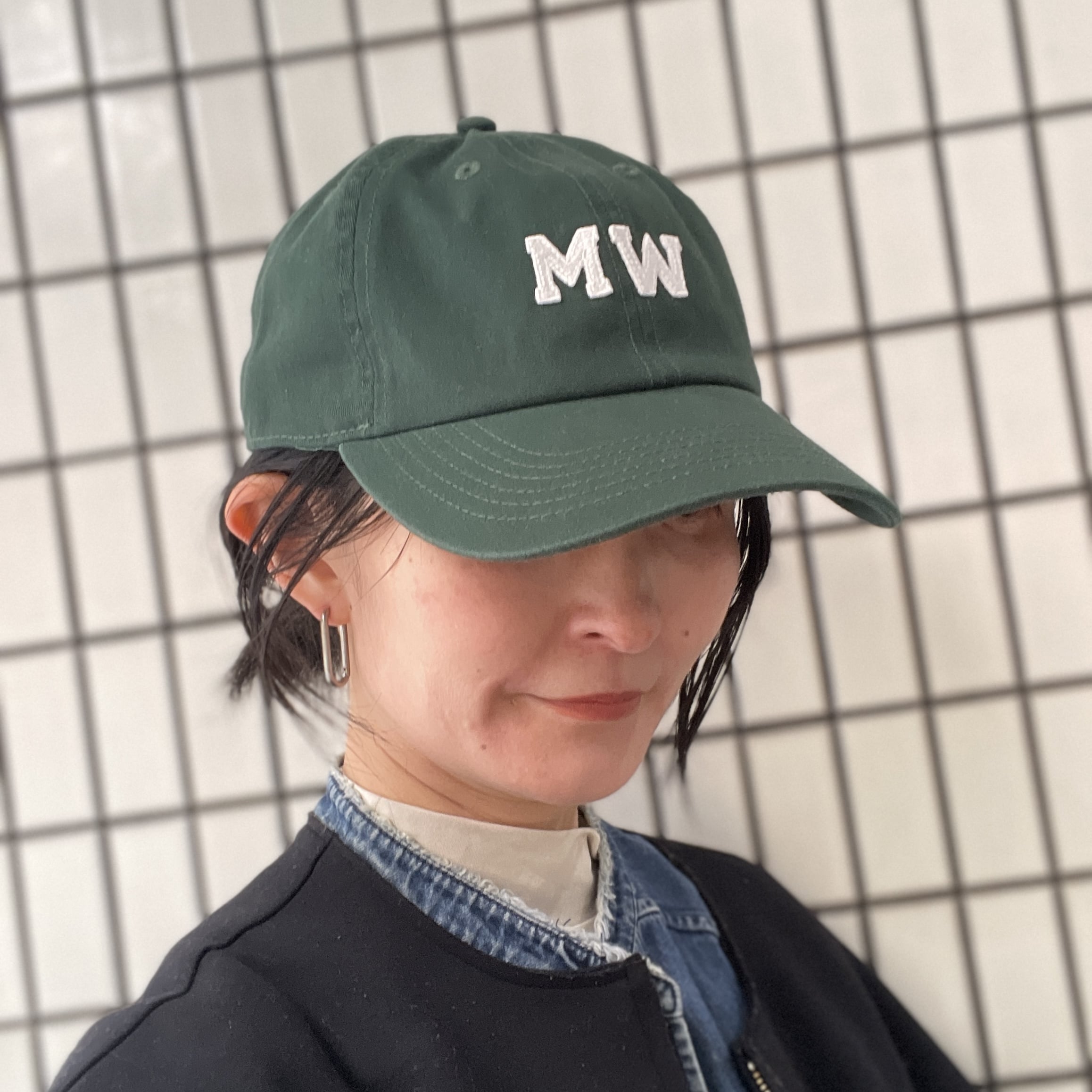 キャップ、ましてやグリーンはスポーティ、ボーイッシュになりそうな感じがしますが、意外とそうならないところが気に入っています。「MW」というロゴに丸みがあるからですかね~。