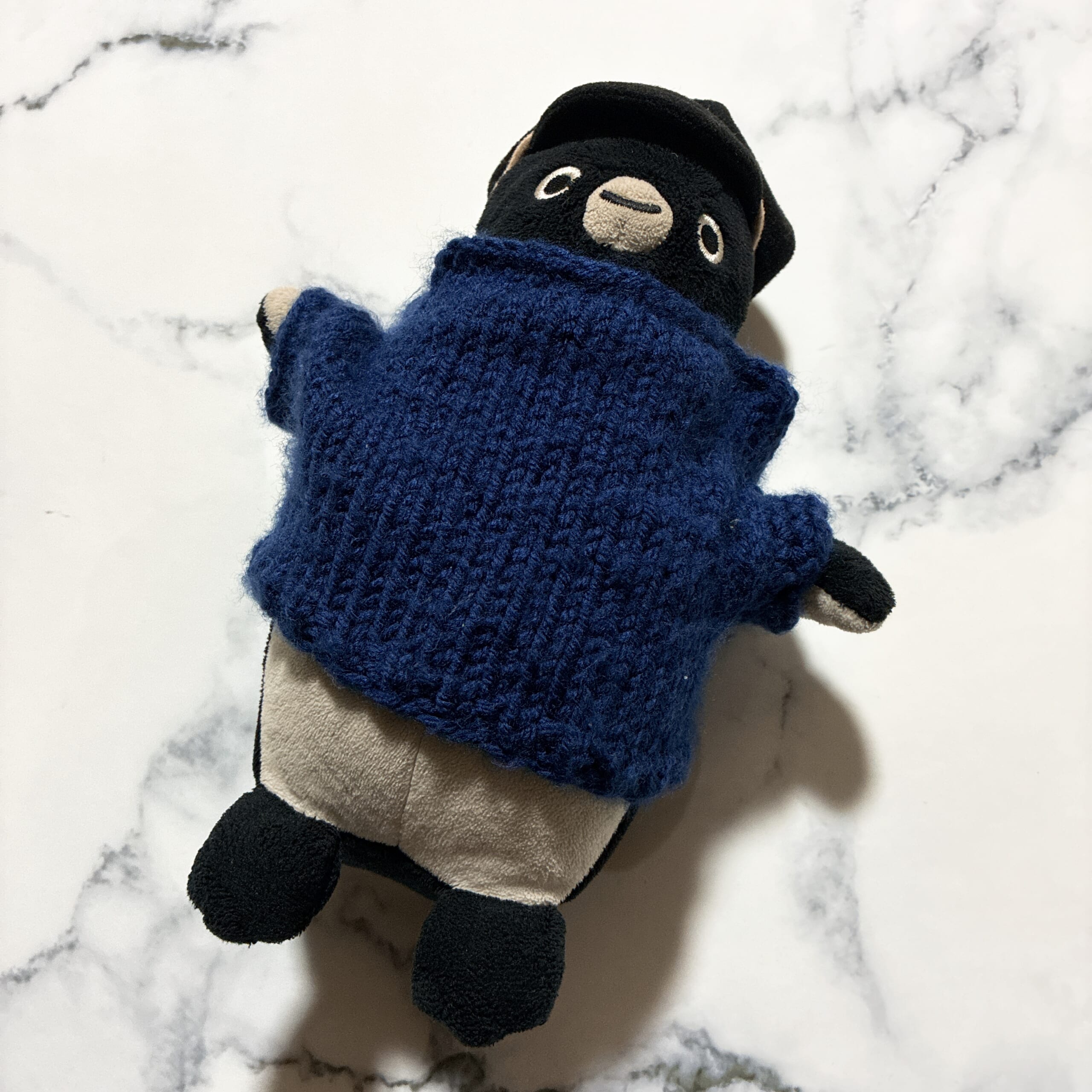 先日、「冬は寒いから!」という息子のリクエストで、編み物の好きなさとさ母にセーターを編んでもらいました。冬仕様のペンギン。
