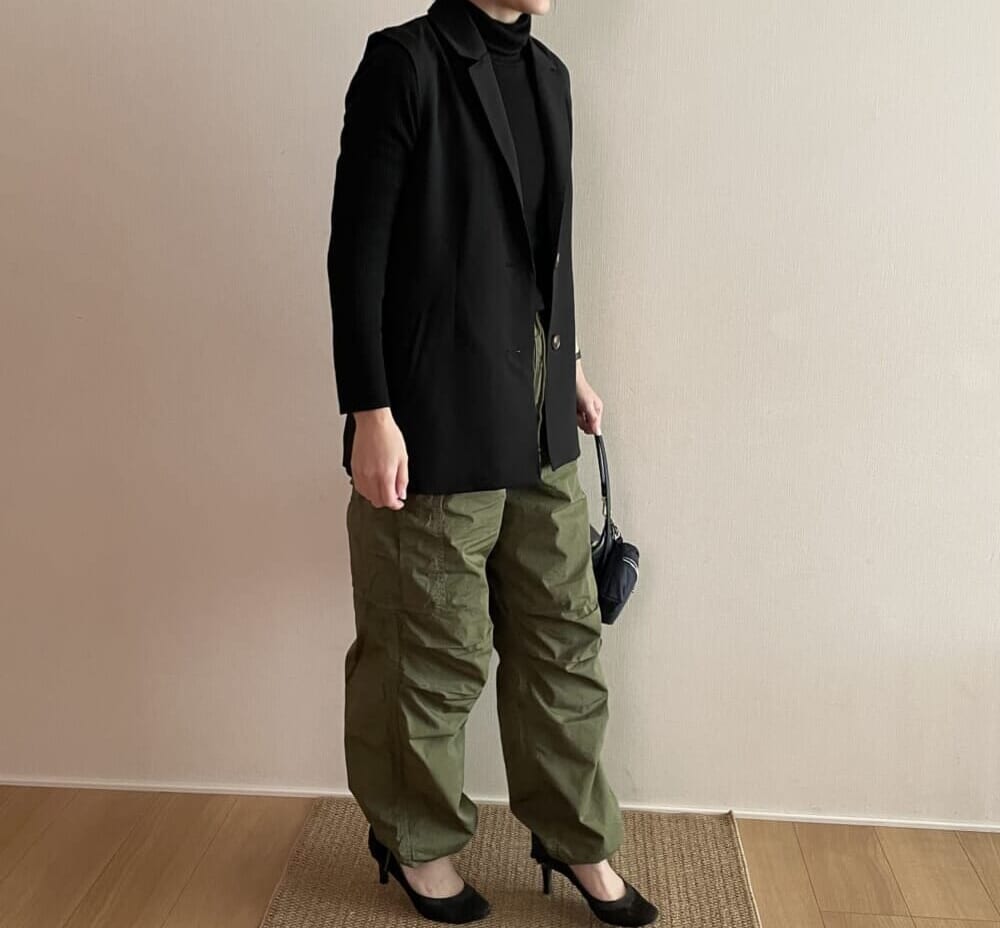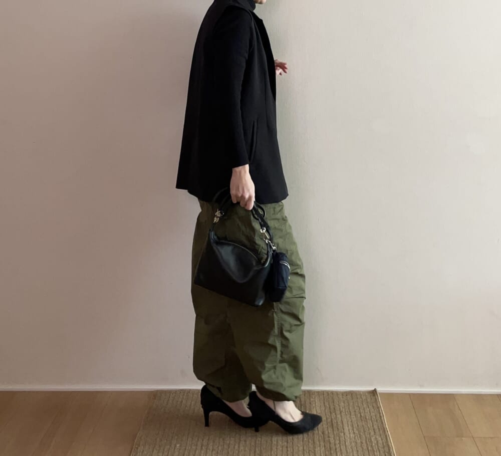 幅広のこちらのパンツ。ウエストと裾が紐で調節できるため、キュッと絞って、きれいめに着てみました。
