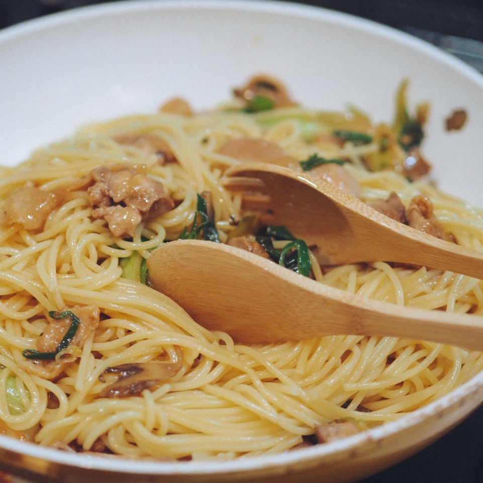 LEE webで紹介されていた、榎本美沙さんの「たっぷりきのことねぎのお醤油パスタ」を作ってみました。