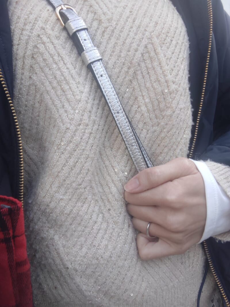 神様に見つけてもらいやすいよう、神社に行くときはキラキラしたものを身に着けるといいらしい。スパンコールとラメ糸の織りこんであるニットに、ショルダー財布もシルバー!