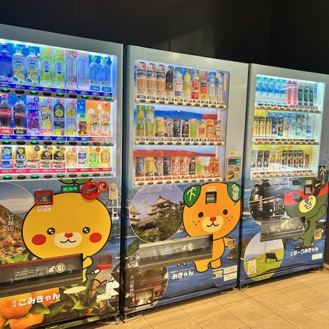 愛媛のイメージアップキャラクター…こみきゃん・みきゃん・ダークみきゃんの自販機