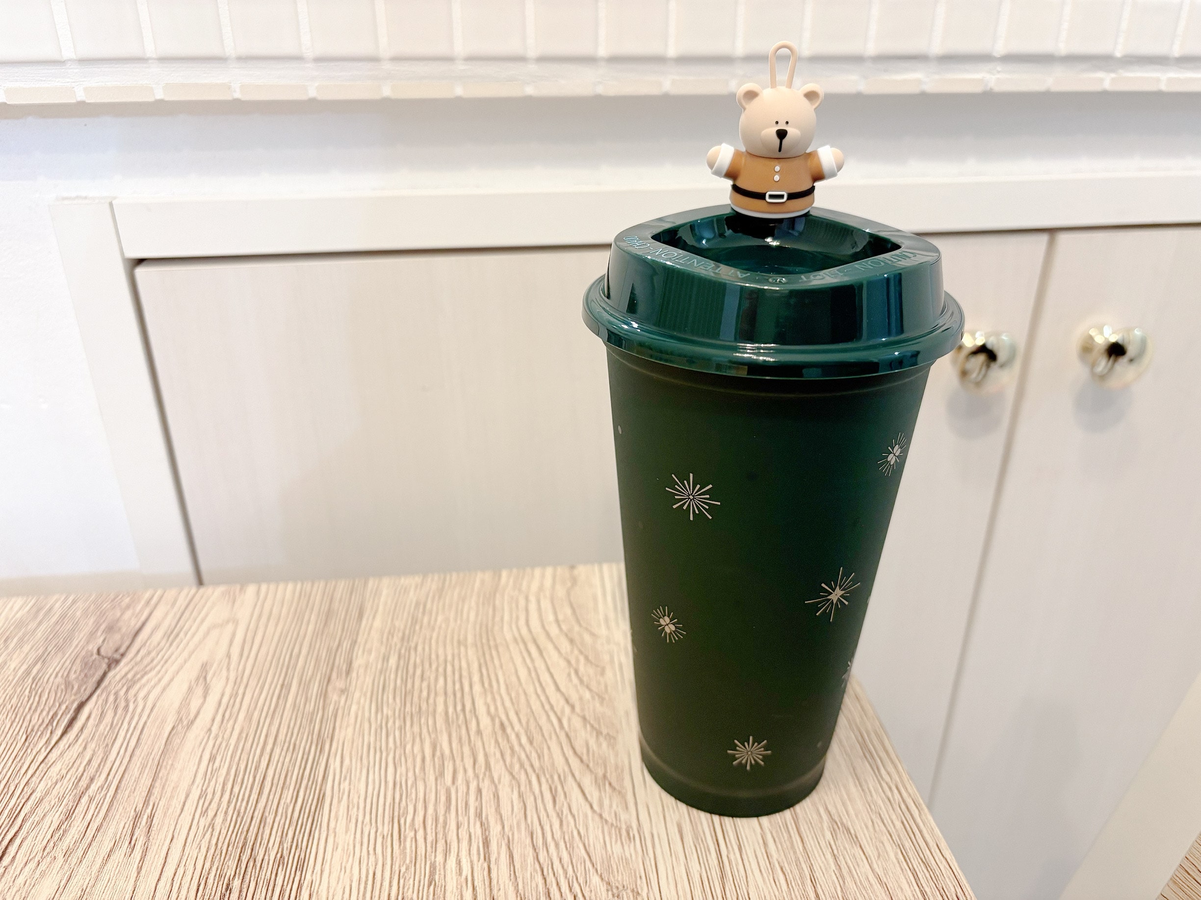 2025年の限定商品ということで、ホリデーらしいグリーンとゴールドのリユーザブルカップを駆け込みで購入しました!店舗レジ横で、発見しました!思わず、「可愛い!欲しい!」と思い、家に連れて帰りました。職場のデスクに置いて使ってますが、置くだけで気分が上がります!