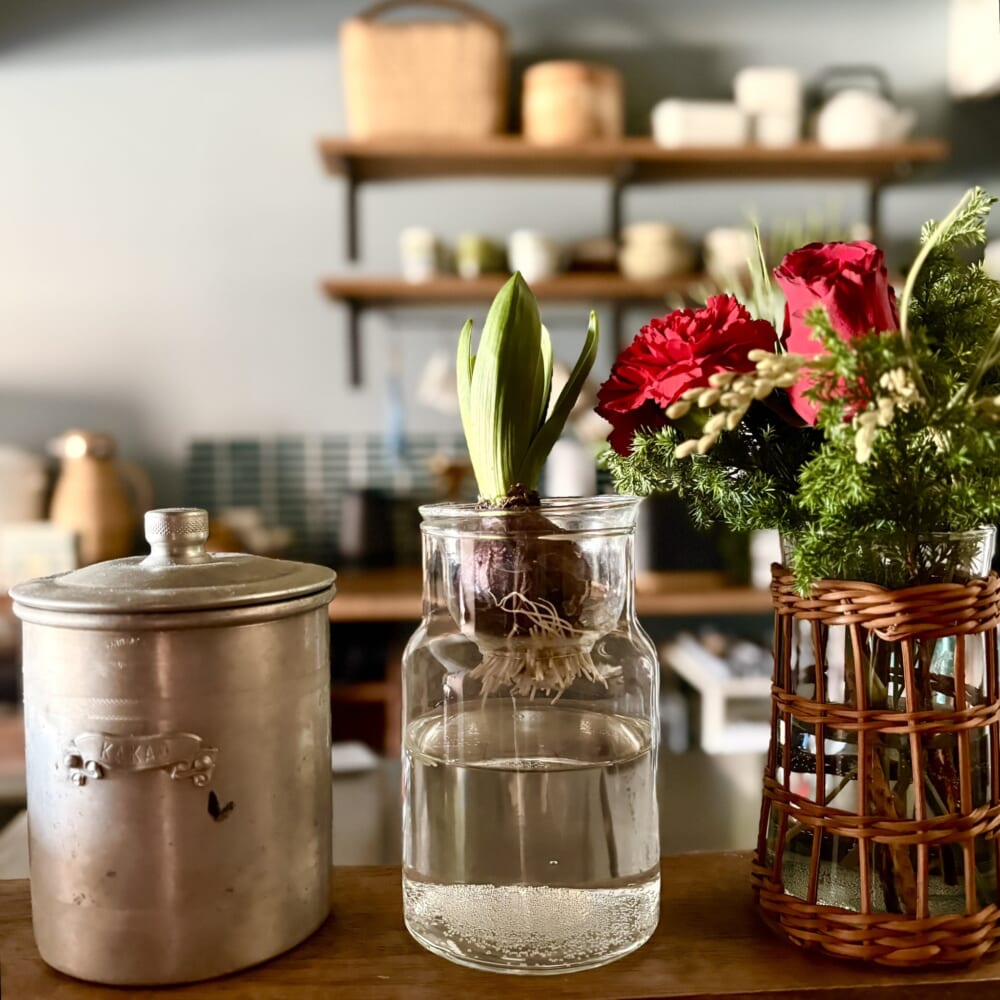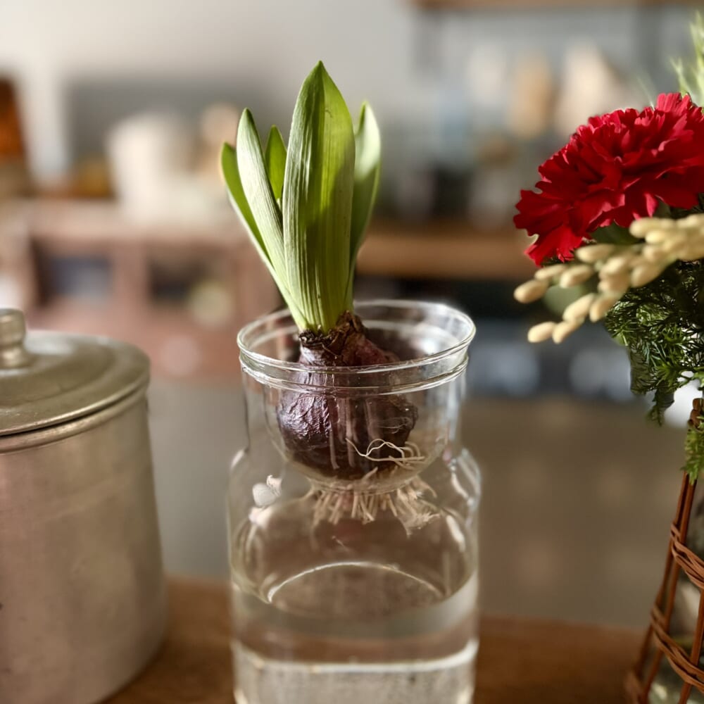 持ち帰って早々に、球根用のフラワーベースに入れてあげます。