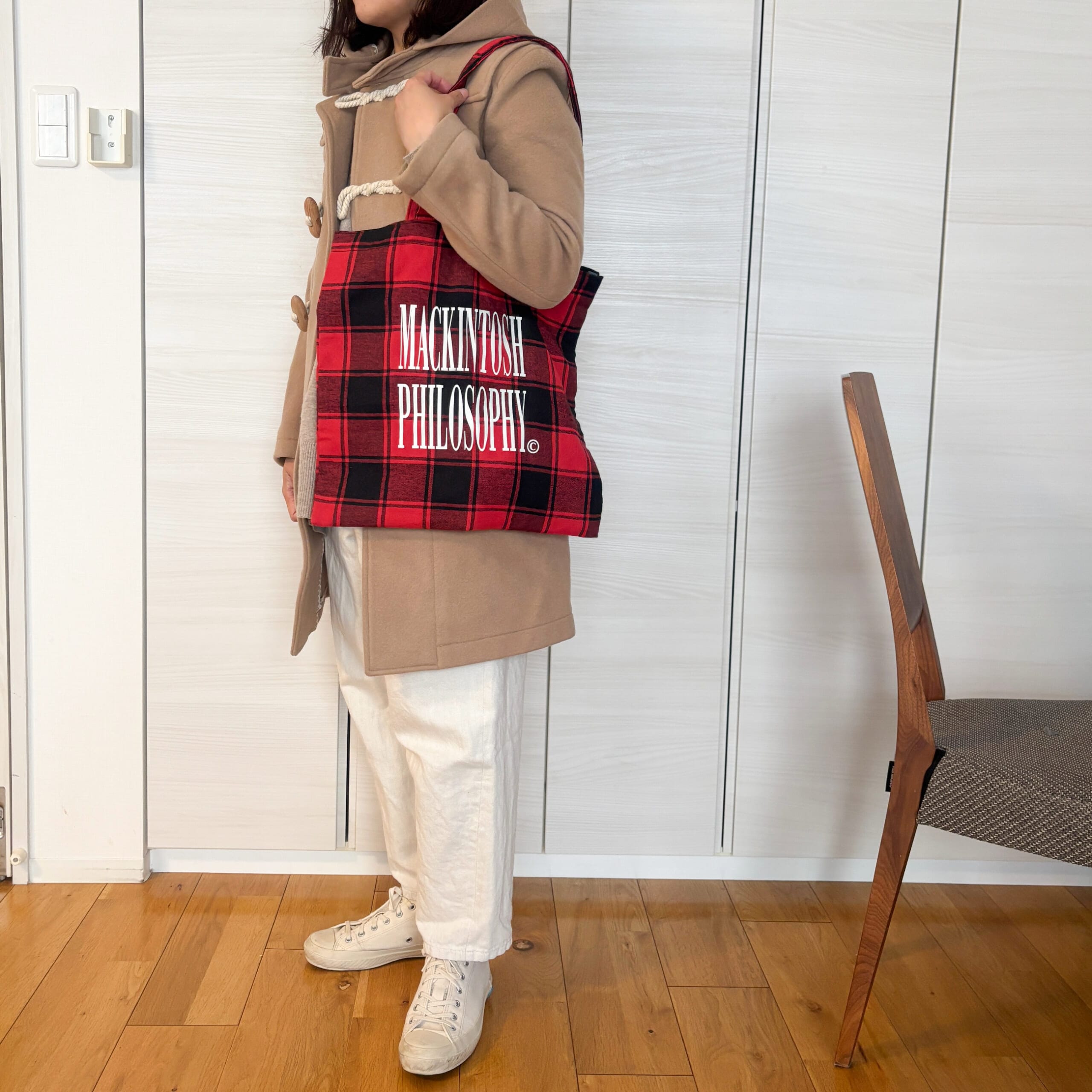 ベージュからアイボリーの同系色でまとめたコーデ。赤チェックのトートをポイントにしました。