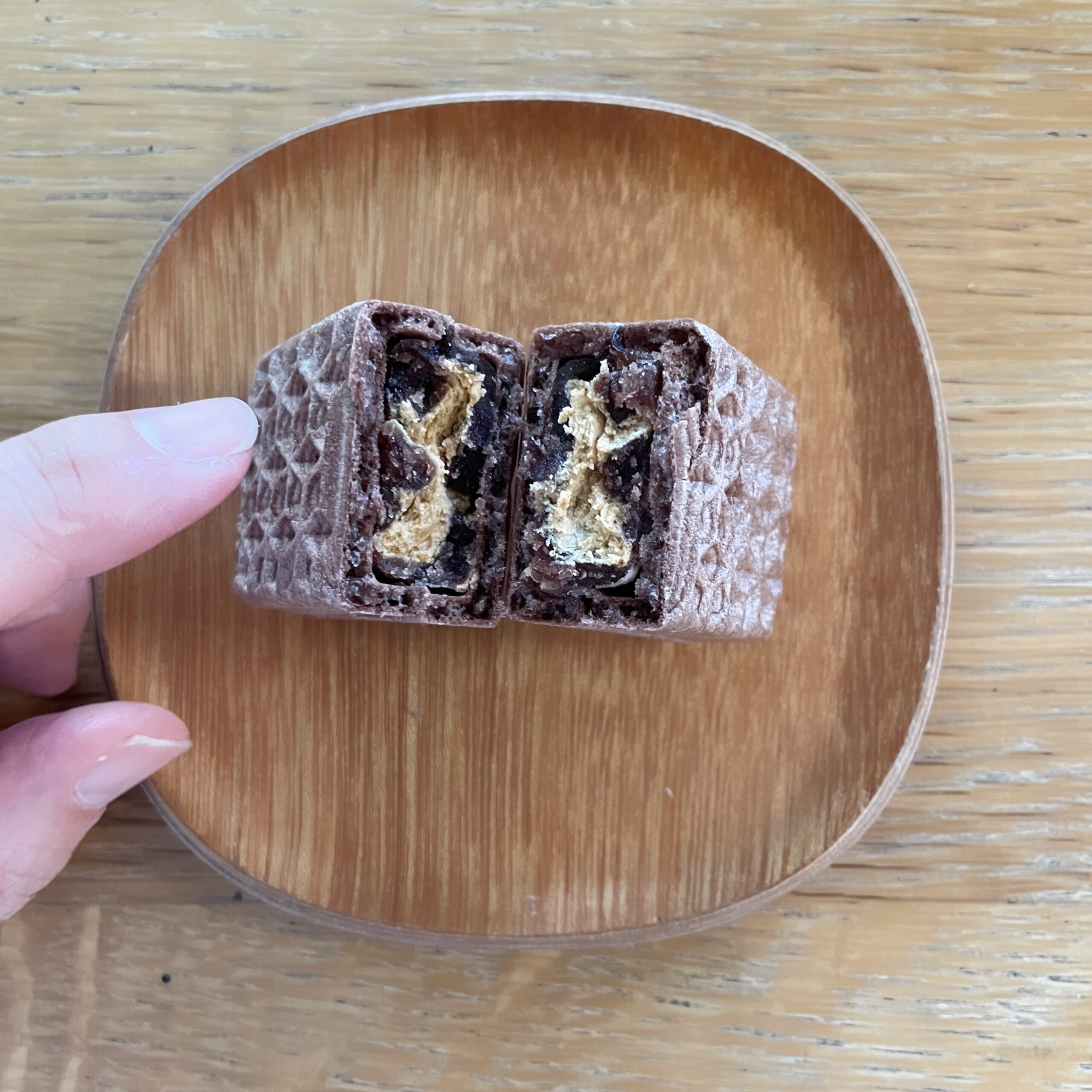 全部が餡ではなくキャラメルがはいっているので、甘すぎず美味しいモナカ