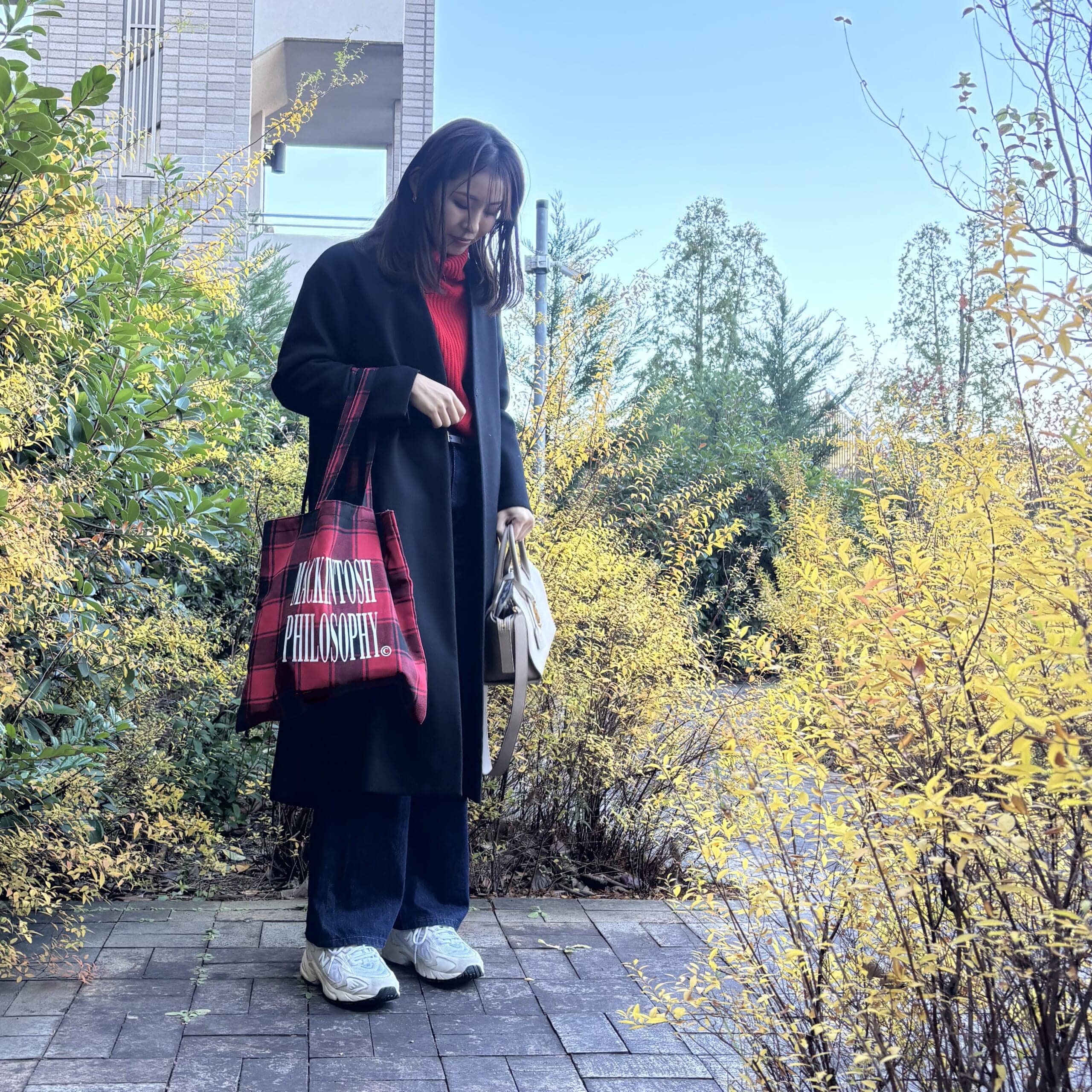 バッグのみを差し色にするコーデもいいですし、ニットも赤にしたとしても、バッグのブラックチェックが活きてうまくまとめてくれています。