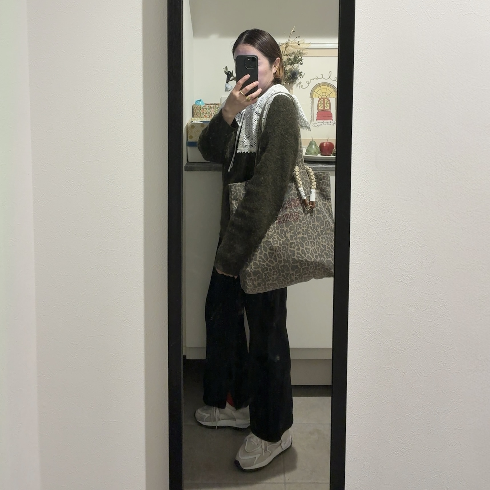 ニット/ACNE studio、パンツ/ever closet、レース襟/KO(ナナデェコール)、バッグ/ZARA、スニーカー/ISYO