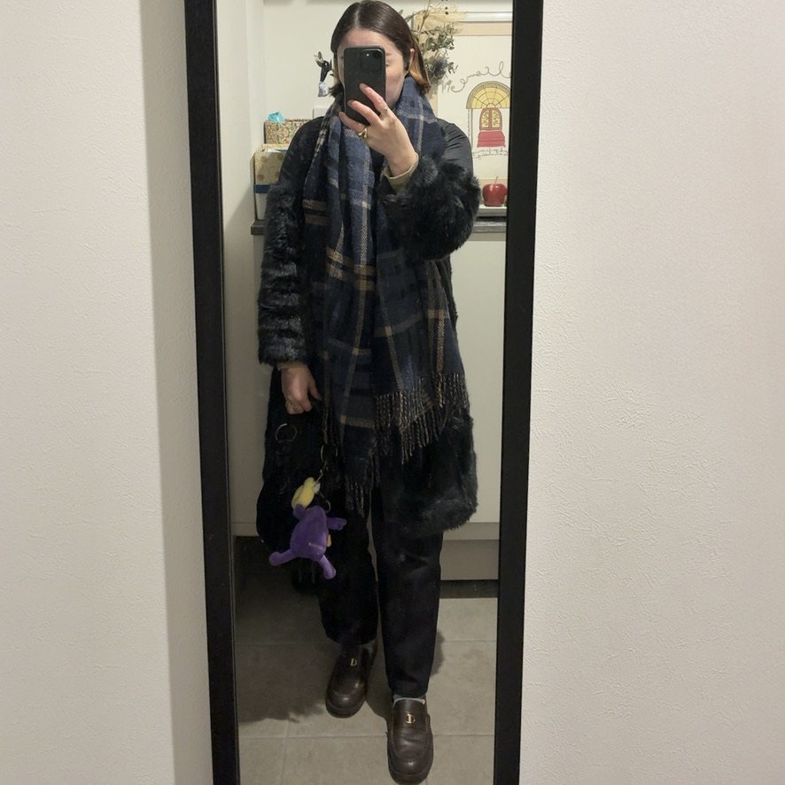 ネイビー×ブラウン系の地味色コーデにはチェックの大判ストールを