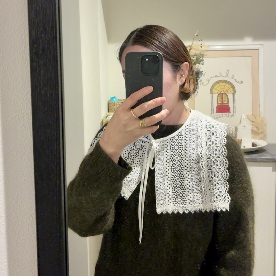 以前も紹介した、白レースのつけ襟は一年中活躍しています。TシャツやロンT、スウェットなどのカジュアルトップスにつけても可愛いし、シンプルめなニットとも相性良し!上質なレースで、スクエアデザインなので大人がつけても甘くなりすぎずに重宝しています。