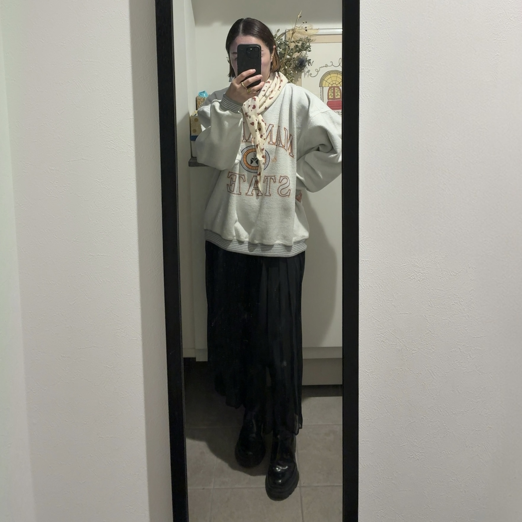 コート/near.nippon、スウェット・プリーツスカート/vintage、ニットバンダナ・ブーツ/ZARA