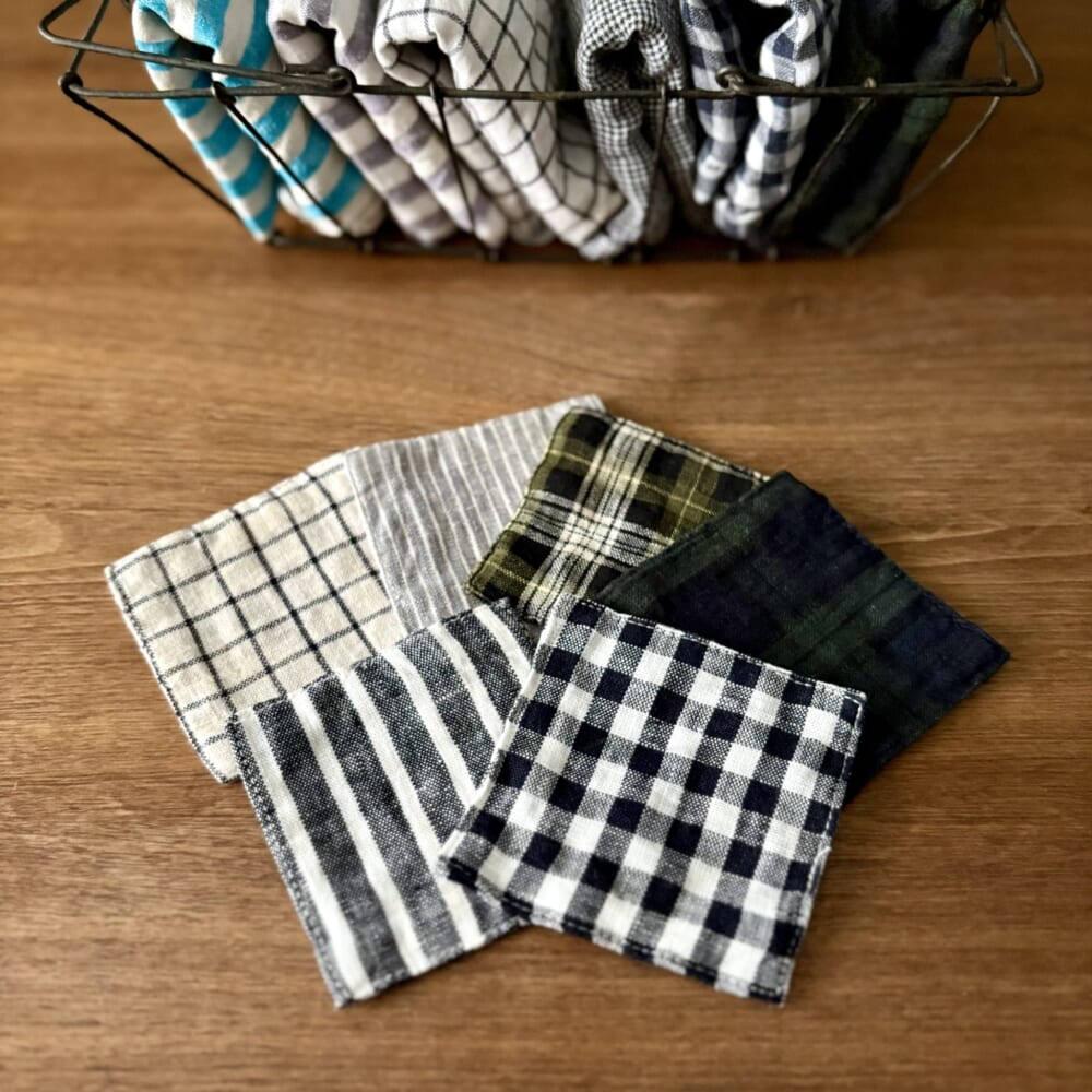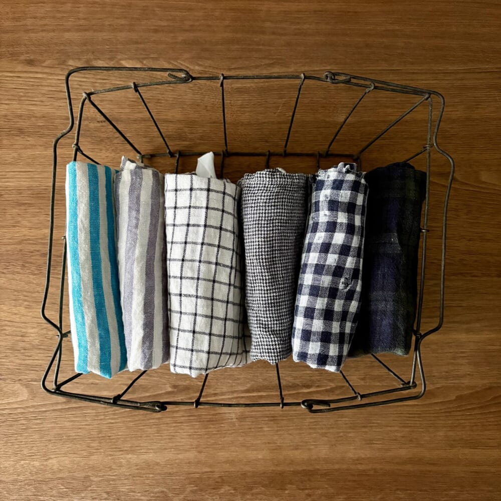 こうやって見ると、キッチンクロスと同じ柄と色のものが何枚もありますね。